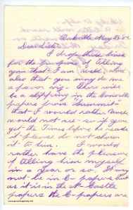 [page 2] We live in a very pretty place. The porch extend along the front of the house and is high. I am even sitting on tip stelps. The front faces the east. The family are all well and all at the table but me. Minnie is calling me to supper, so I must go. I have eat my supper and made a call and entertained three callers who have just left.—They are now old acquaintances—have known them since the first time I cane in City. Last night—my fellow came, he will leave the city tomorrow—how lonesome I will be—You ought to try to come to see me soon. I think now that I cannot come to see you all very soon. “I would if I could.”