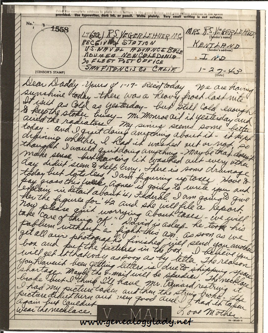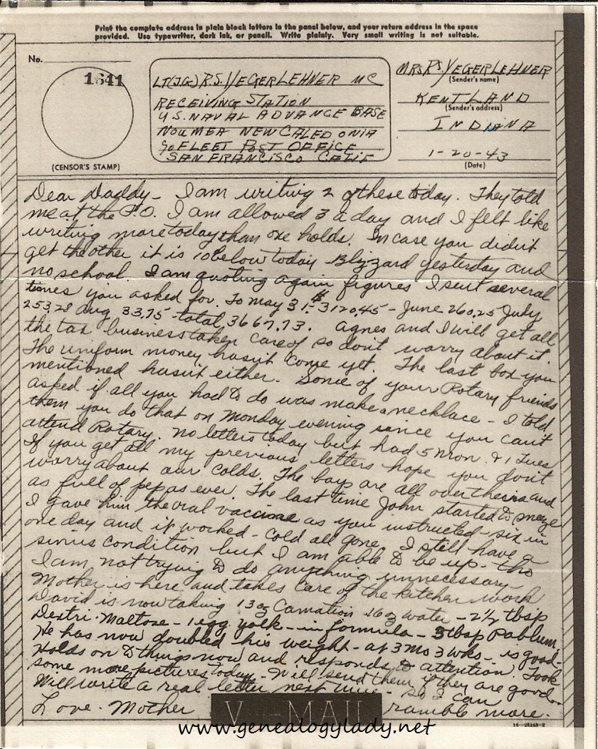 I’ve re-read and I believe most of the things are answered so maybe just some comments here and there. In the first place instead of getting only your letter of Jan. 14, I got both 13 & 14 in the same envelope. Maybe that is something only what if the 14th hadn’t gotten here. I’m not scolding just kidding. Your writing every day either hits the mail as it comes or my box where ever it is gets so full the postal clerk has to get rid of some any way that was about the latest yet of any around here. Even the V-mail was later than most other mail.