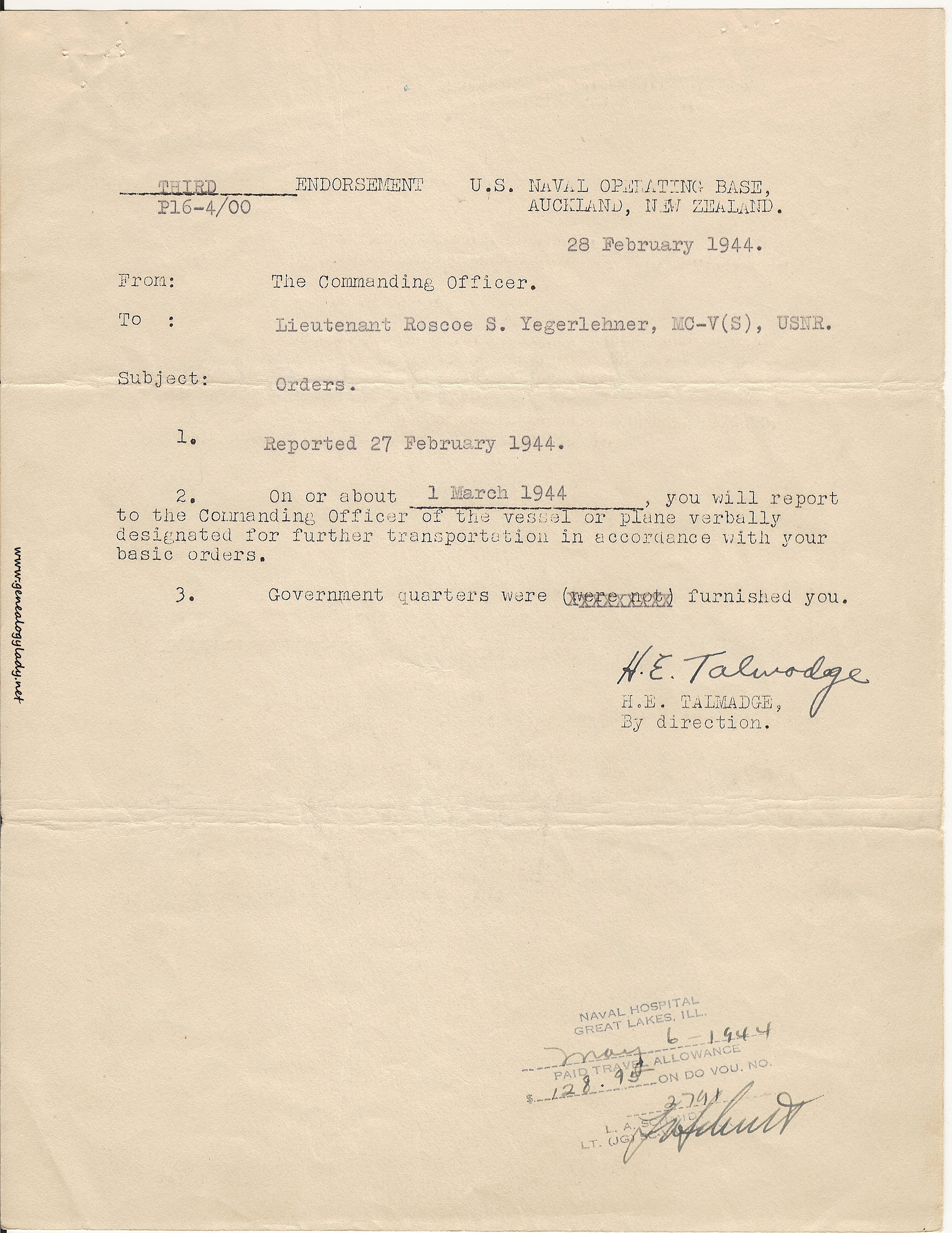 To: Lieutenant Roscoe S. YEGERLEHNER, MC-V (S), USNR