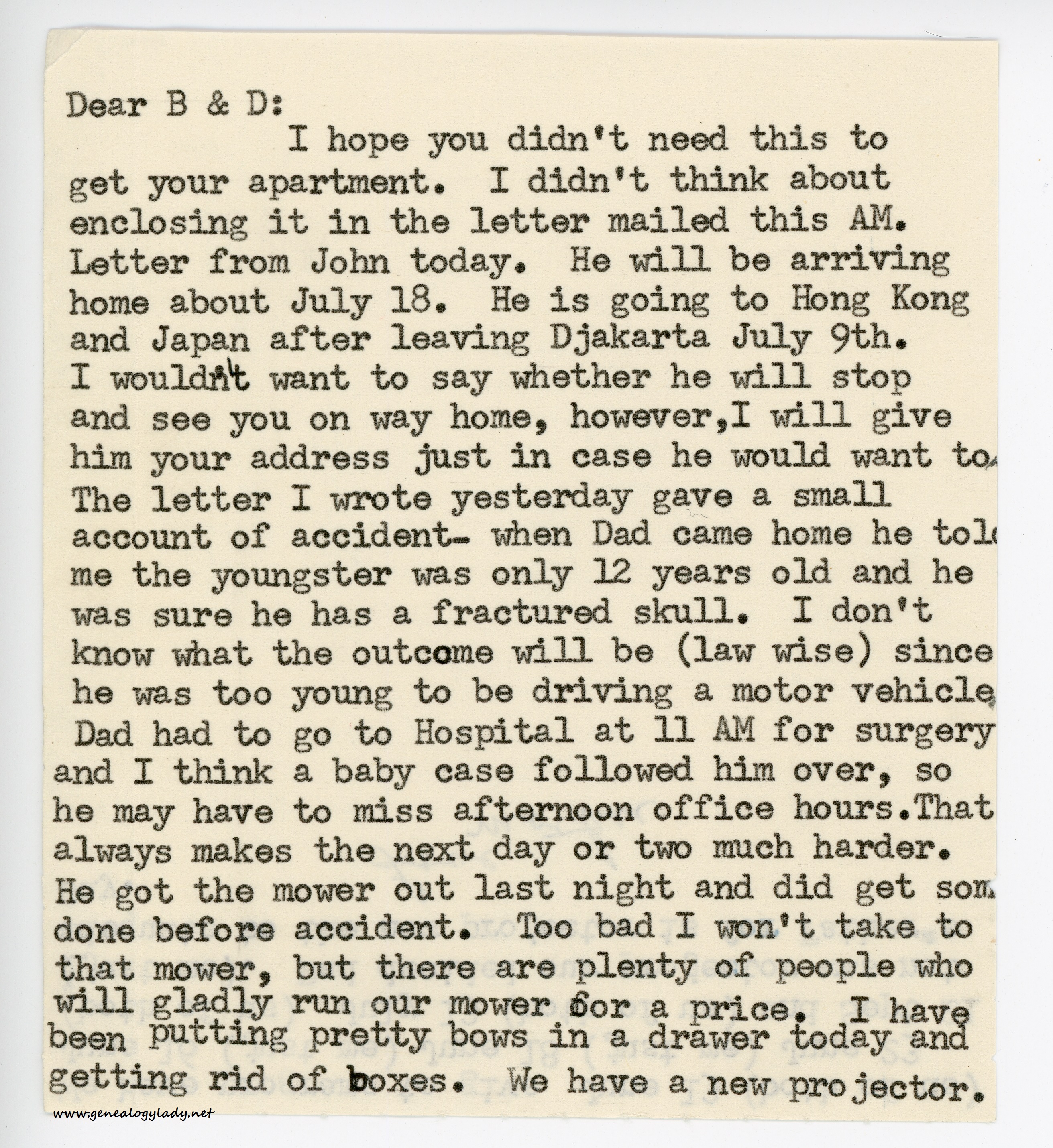 I have been cleaning what used to be your room – now I just call it the extra room – and have found a place to get rid of all those books which had been stored there since we have lived here. There is a little library at Lake Village and they have a Book Mobile and said (Mrs. Arbuckle) they would be glad to have anything, so I am taking everything I want to give away and she said if they couldn’t use something, they would give it to someone else. I have the back end of the blue Cadillac about as full as it will hold of books and magazines. It is surprising how much one can get rid of when one decides to just throw away. I just wonder why we kept all those text books, etc., so long. Well now I have a lot of empty shelves and I suppose when John gets home he will fill those shelves with his things. Maybe it is a good thing I got busy.