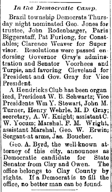 Brazil township Democrats Thursday night nominated Geo. Jones for trustee, John Rodenbarger, Paris Biggerstaff, Pat Furlong, for Constables; Clarence Weaver for Supervisor. Resolutions were passed endorsing Governor Gray’s administration and Senator Voorhees and Turpie, and favoring Cleveland for President and Gov. Gray for Vice President.
