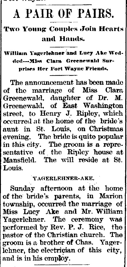 “Funeral Services of Mary Yagerlehner,” Wabash Plain Dealer (Wabash, Indiana), 6 September 1917, p. 1, col. 7; digital image, Newspaper Archive (http://newspaperarchive.com : accessed 14 December 2013).