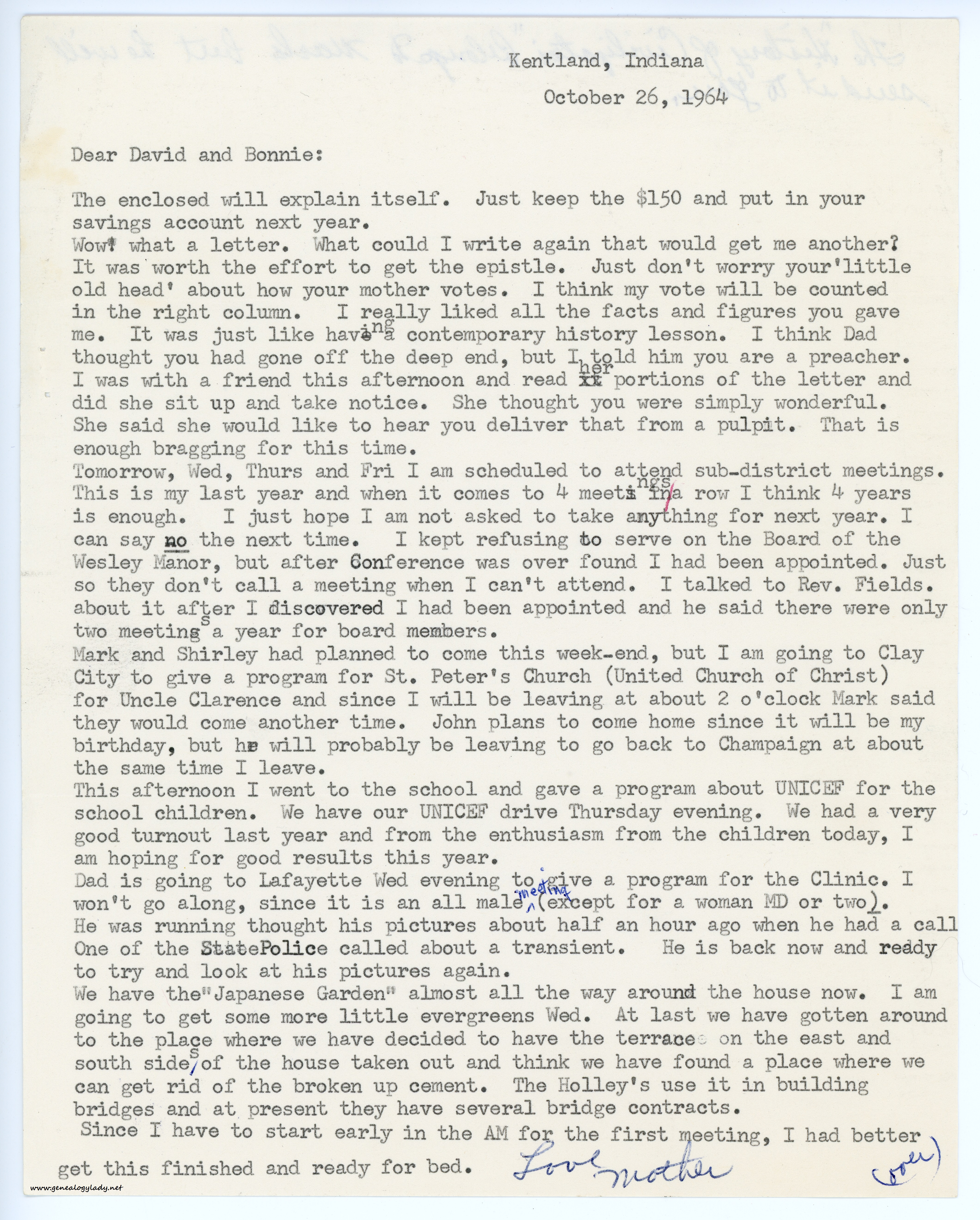 You shouldn’t fret yourself so much about the outcome of Nov. 3. I can remember when H.S.T. won, I went into the Rexall store and Art was ready to commit hara-kiri (almost). He thought the country would go to the dogs for sure. At the last bridge club meeting it was like attending a wake. Everyone was sure B.G. would lose – of course there were a couple who get their living in the court house and it might mean a change of jobs for them. Regardless of the outcome things have a way of adjusting so don’t be so disturbed.