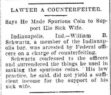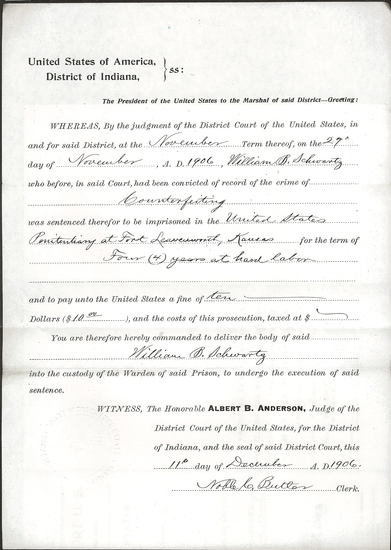 Indictment Counterfeiting, 22 November 1906; United States vs. William B. Schwartz, case no. 6742; Criminal Case Files, U. S. District Court, Southern District of Indiana, 1854-1981; Records of the District Courts of the United States, Record Group 21; National Archives, Chicago, Illinois.