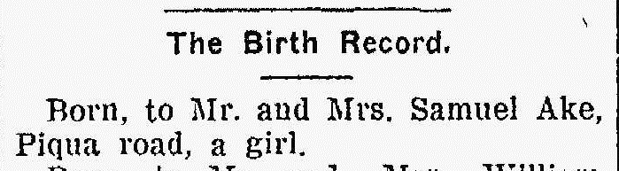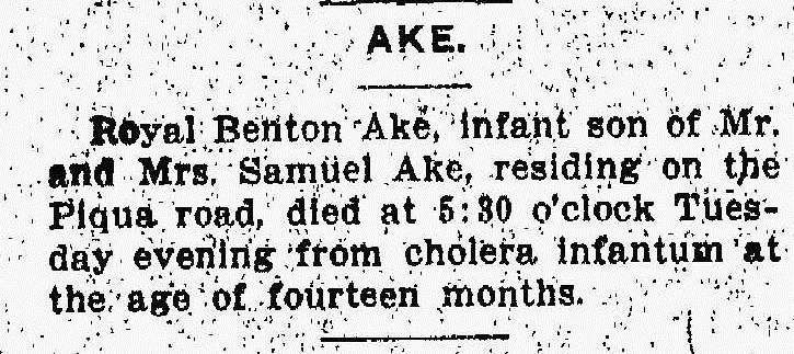 Royal Benton Ake, infant son of Mr. and Mrs. Samuel Ake, residing on the Piqua road, died at 5:30 o’clock Tesday evening from cholera infantum at the age of fourteen months.