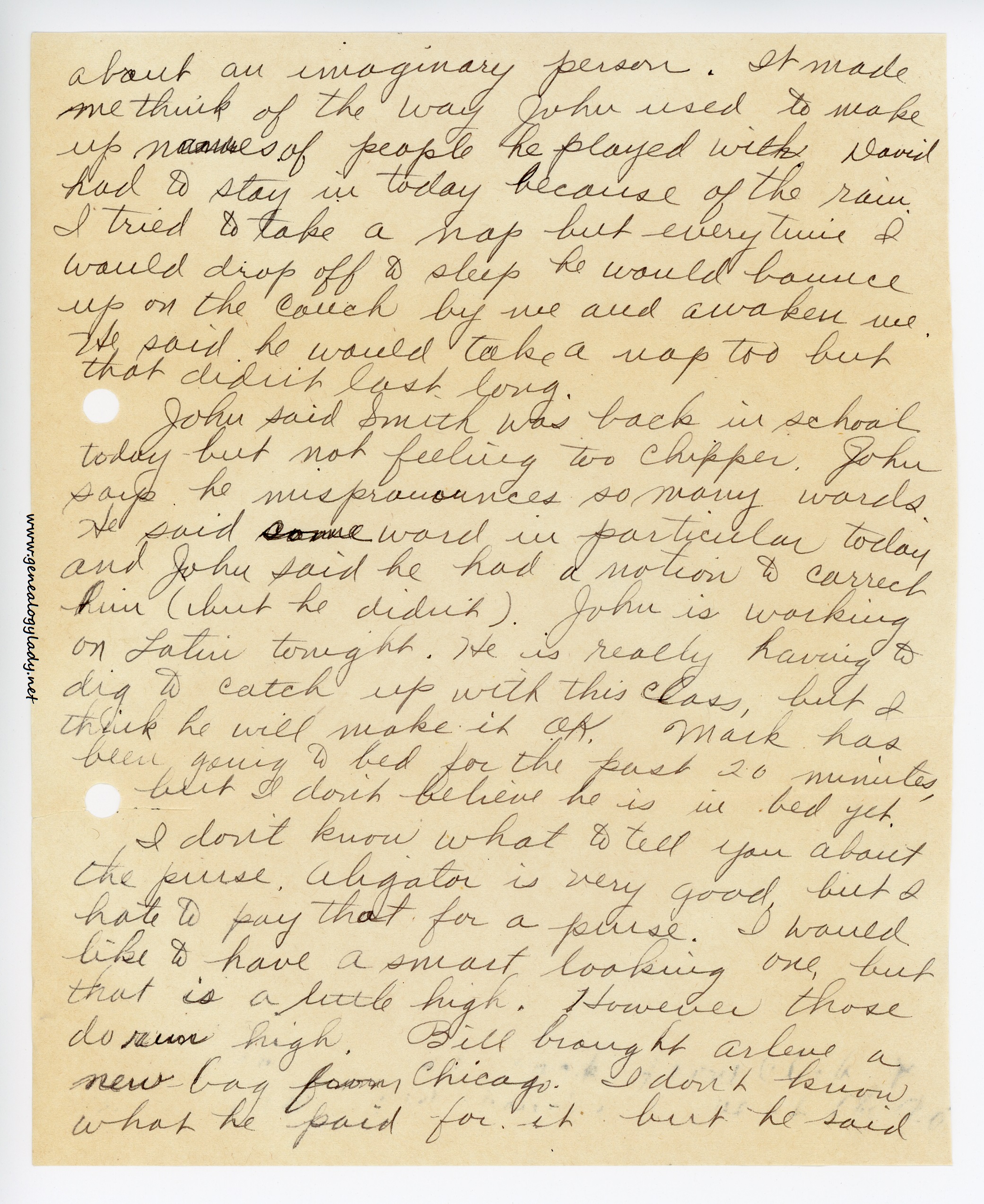It’s getting near 11:30 and that means time to get lunch started. I’ll have to sign the report cards too so they can be returned. Mark’s grades are Social Studies – B, English – C, Arithmetic – C, Physical Ed – B, Health & Science – B, Band – D (and he was mad – even John said that wasn’t fair), Art – C, Ag – B, Citizenship – A. John got B in Band and gave himself B in Citizenship because they grade themselves and he was too modest to give himself A – but says after this he will because everybody else does. He wasn’t very pleased about the B in Band but he got A in everything else – History, Latin, Speech & Geometry. The whole band was mad at Cole yesterday for the grades he dished out. From all I can gather no one in the band likes him.