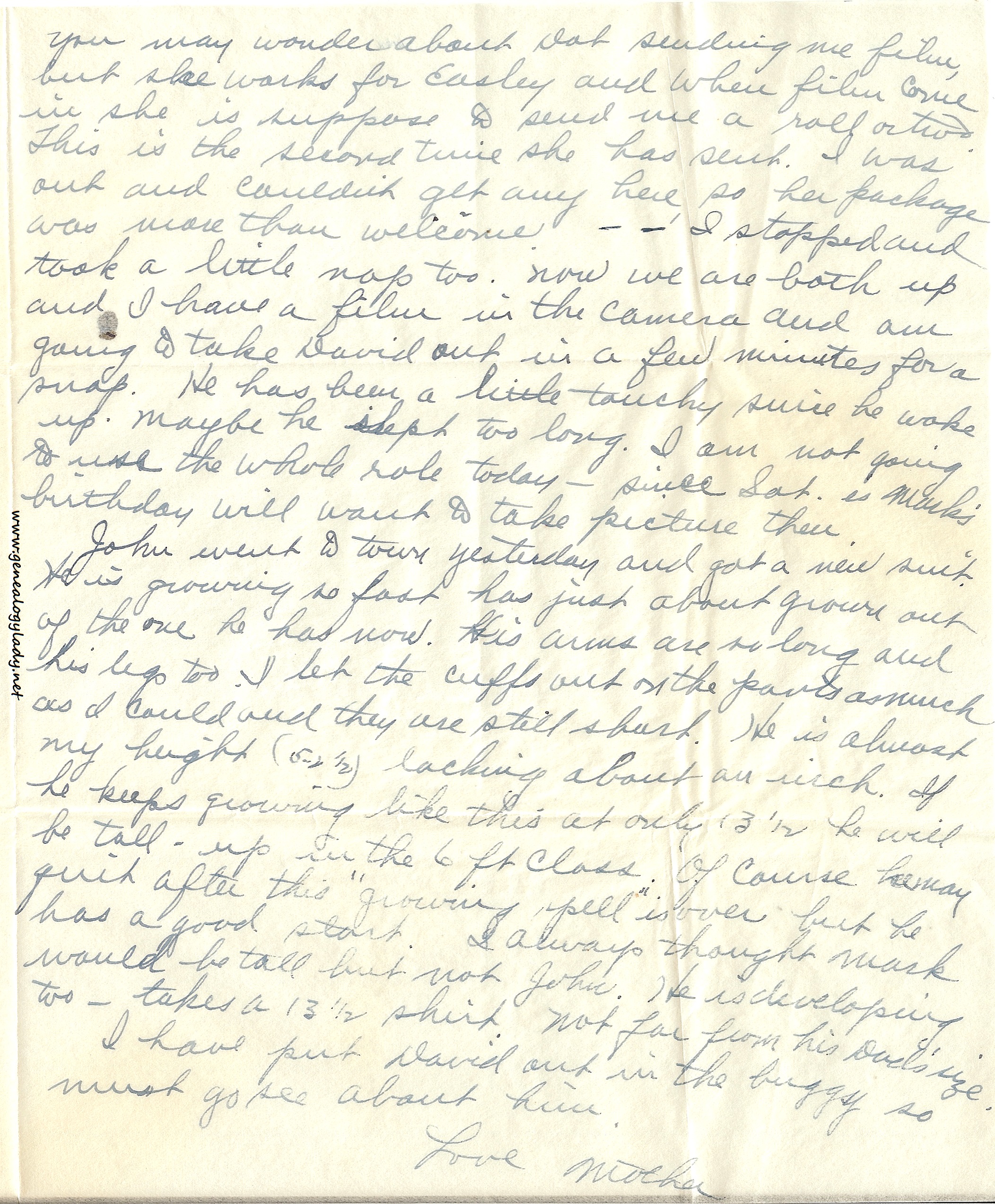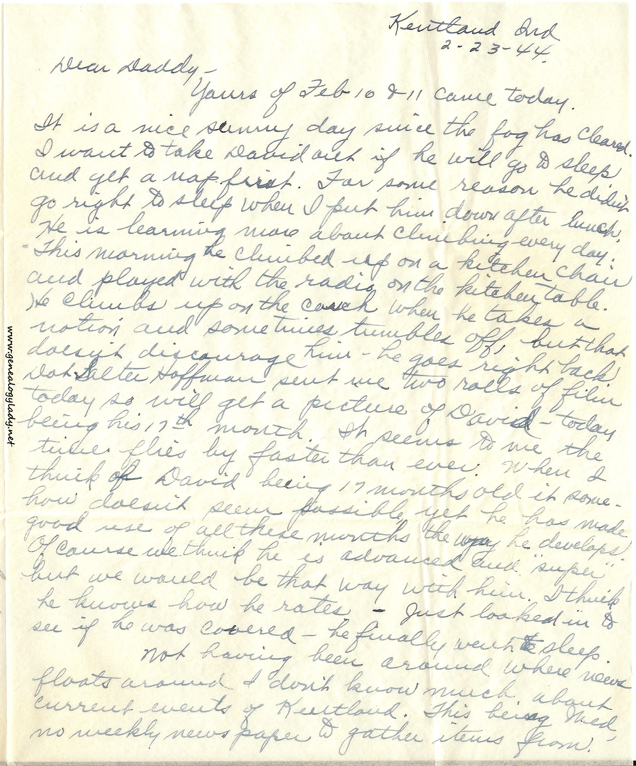 [page 2] and I can’t leave him now but could come over after school if I could do anything to help. He said he had gotten them all fed and they were pretty well taken care of then. They had Dr. M. yesterday and today. I didn’t call the Dr. to come I just asked him about giving sulfa & he told me what dosage to give and how often. David is asleep now. Hope he takes a nice long nap. I try to keep him in his bed but he gets tired of being kept up, so have to turn him loose when he gets to dissatisfied. He takes his stuffed toys and loves then, then throws them down. He pulls the lovey stuff on me too when he wants something very much. He certainly understands things we say to him. I told him he couldn’t crawl around the floor. He got down and began to crawl. I said “do you want me to put you back in your bed,” and he quit crawling. I put him on the toidey seat just as soon as he finishes his breakfast and he usually has his first B.M. I am not always lucky enough to get the next, but if I put him on the toidey after his nap he usually saves a diaper. He tries to feed himself, but to keep from wasting Pablum I give him a spoon to work with and at the same time feed him with another spoon.