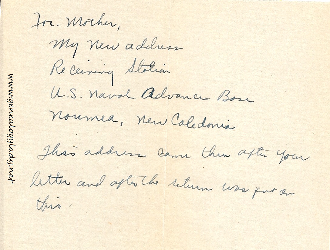 The big secret has been revealed. Where was Roscoe exactly? The Navy finally allowed the men in New Caledonia to give their specific addresses to loved ones at home. Since the beginning of September 1942, Roscoe was stationed at the U.S. Naval Advance Base in Nouméa, New Caledonia. For the first time, Roscoe used his specific address on the return envelope as well as including it inside the letter for all to use. I can’t imagine it was much of a security breach at this point. The Japanese surely knew there was an American base on New Caledonia. Roscoe had provided many clues for the family at home. The islanders spoke French. They had a distinctive red hair color. He included references to a certain National Geographic Magazine article about New Caledonia from July 1942. And of course, he gave his location to Gladys in code, right from the very beginning. The above postcard was mixed in with the letters. There is no writing on the back so it was most likely sent as a visual reference for Gladys and the boys, tucked into one of the letters.