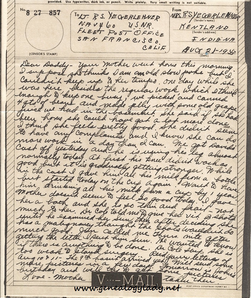 Another birthday for our John – 13 – He looks the part – voice changing – growing fast – face full of pimples and blackheads. At present he is listening to Radio Readers’ Digest. He likes to get it every Sunday evening. I baked & decorated a cake, made ice cream & had the Zell girls & Jimmy come to help eat them – they ate almost all the cake and so far no tummy aches. I gave John a dollar, your Mother gave him 25¢ – he rec’d the $2⁰⁰ you sent, the Zells gave him sox & a hankie, so he fared pretty well. Bobby is gone and so are the Krull children so they didn’t get in on the refreshments. I was feeding David his 3 P.M. meal, Mark was working on a block of balsa wood and his knife slipped and cut his hand around the base of his thumb. It bled so much I couldn’t tell at first the cut was so extensive but after trying to wash