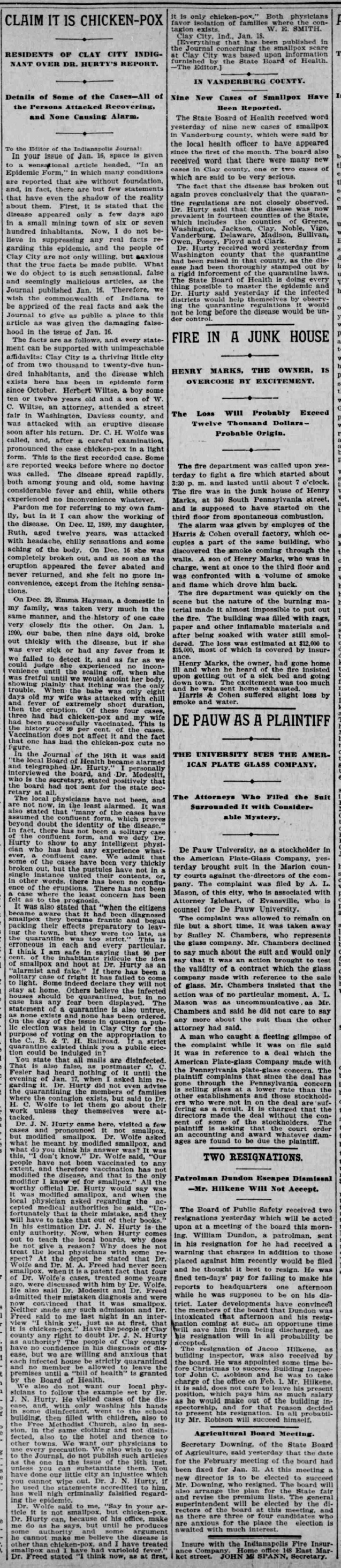 In your issue of Jan. 16, space is given to a sensational article headed, “In an Epidemic Form,” in which many conditions are reported that are without foundation, and, in fact, there are but few statements that have even the shadow of the reality about them. First, it is stated that the disease appeared only a few days ago in a small mining town of six or seven hundred inhabitants. Now, I do not believe in suppressing any real facts regarding this epidemic, and the people of Clay City are not only willing, but anxious that the true facts be made public. What we do object to is such sensational, false and seemingly malicious articles, as the Journal published Jan. 16. Therefore, we wish the commonwealth of Indiana to be apprised of the real facts and ask the Journal to give a public a place to this article as was given the damaging falsehood in the issue of Jan. 16.