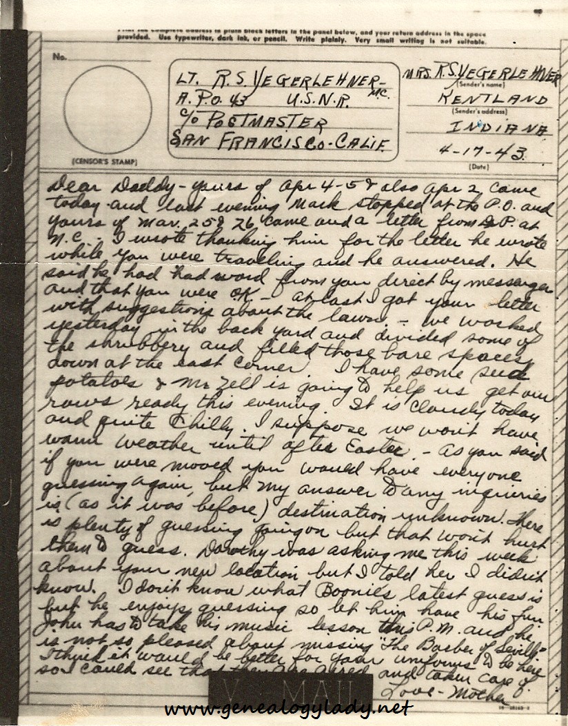 Dear Daddy – Yours of Apr 4 – 5 & also Apr 2 came today and last evening Mark stopped at the P.O. and yours of Mar. 25 & 26 came and a letter from Dr. P. at N.C. – I wrote thanking him for the letter he wrote while you were traveling and he answered. He said that you were OK – At last I got your letter with suggestions about the lawn – we worked yesterday in the back yard and divided some of the shrubbery and filled those bare spaces down at the east corner. I have some seed potatoes & Mr. Zell is going to help us get our rows ready this evening. It is cloudy today and quite chilly. I suppose we won’t have warm weather until after Easter – As you said if you were moved you would have everyone guessing again, but my answer to any inquiries is (as it was before) destination unknown. There is plenty of guessing going on but that won’t them to guess. Dorothy was asking me this week about your new location but I told her I didn’t know. I don’t know what Boonie’s latest guess is but he enjoys guessing so let him have his fun. John has to take his music lesson this P.M. and he is not so pleased about missing “The Barber of Seville.” I think it would be better for your uniforms to be here so I could see that they are aired and taken care of.