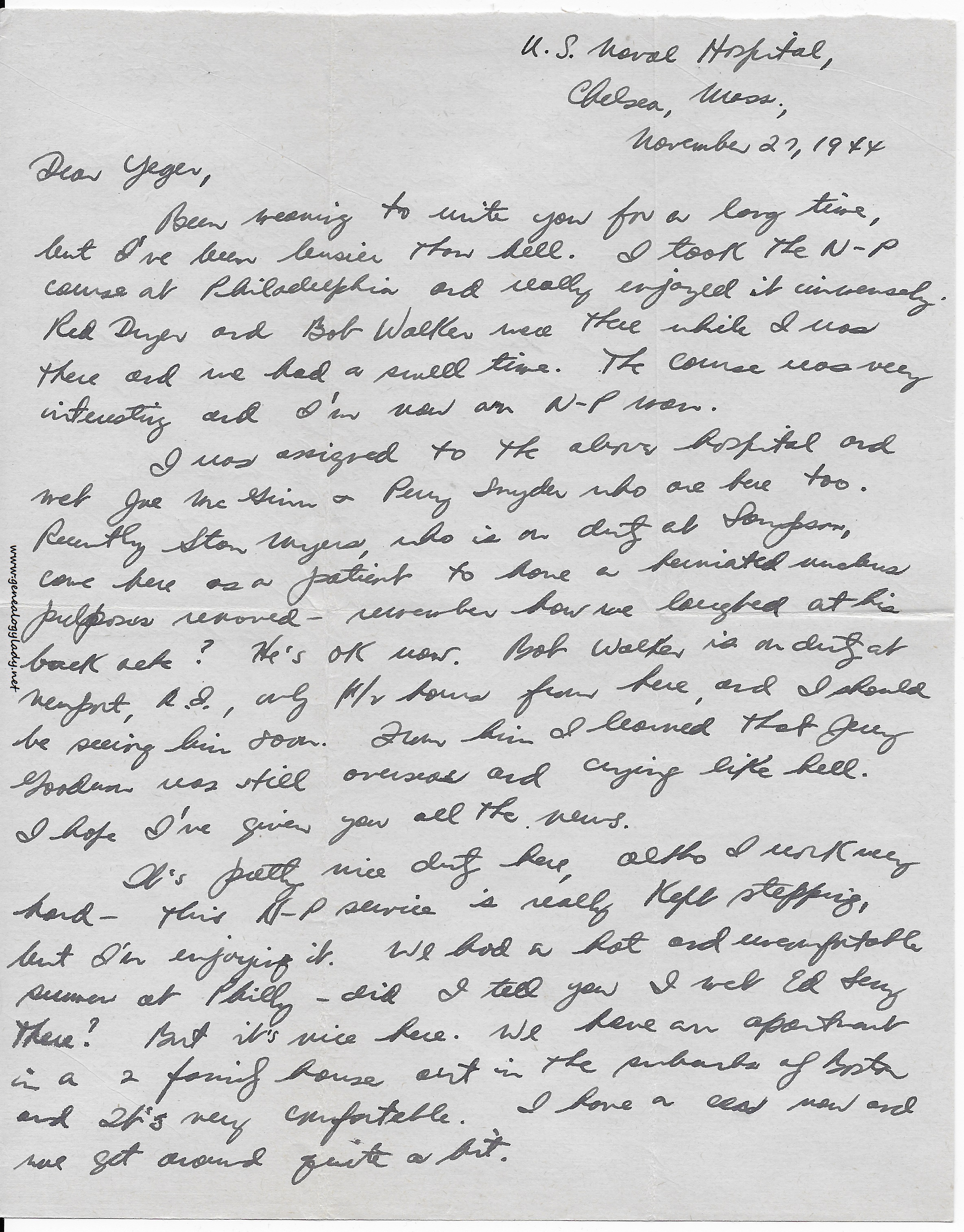 I was assigned to the above hospital and met Joe McGinn & Perry Snyder who are here too. Recently Stan Myers, who is on duty at Longson [?], came here as a patient to have a herniated nucleus pulposus removed – remember how we laughed at his back ache? He’s OK now. Bob Walker is on duty at Newport, R.I., only 1½ hours from here and I should be seeing him soon. From him I learned that Jerry Goodman was still overseas and crying like hell. I hope I’ve given you all the news.