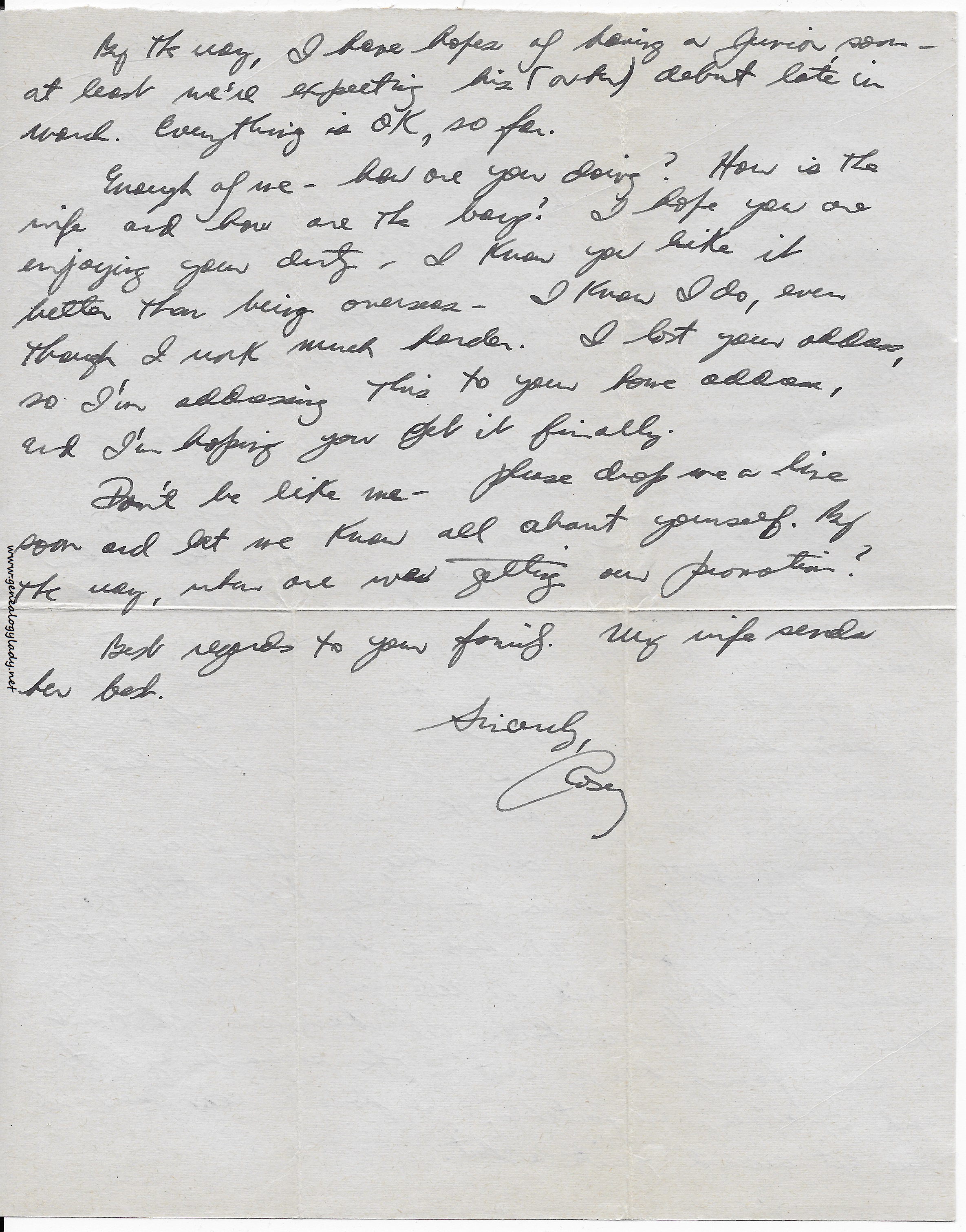 Enough of me – how are you doing? How is the wife and how are the boys? I hope you are enjoying your duty – I know you like it better than being overseas – I know I do, even though I work much harder. I lost your address so I’m addressing this to your home address, and I’m hoping you get it finally.