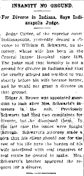 Judge Carter, of the superior court Indianapolis, yesterday denied a divorce to William B. Schwartz, an attorney, whose wife has been in the Central Indiana Insane Hospital since 1890. The judge said that insanity is not a ground for divorce in Indiana and the cruelty alleged and testified to was shortly before his wife became insane, and he would not grant a divorce on that ground.