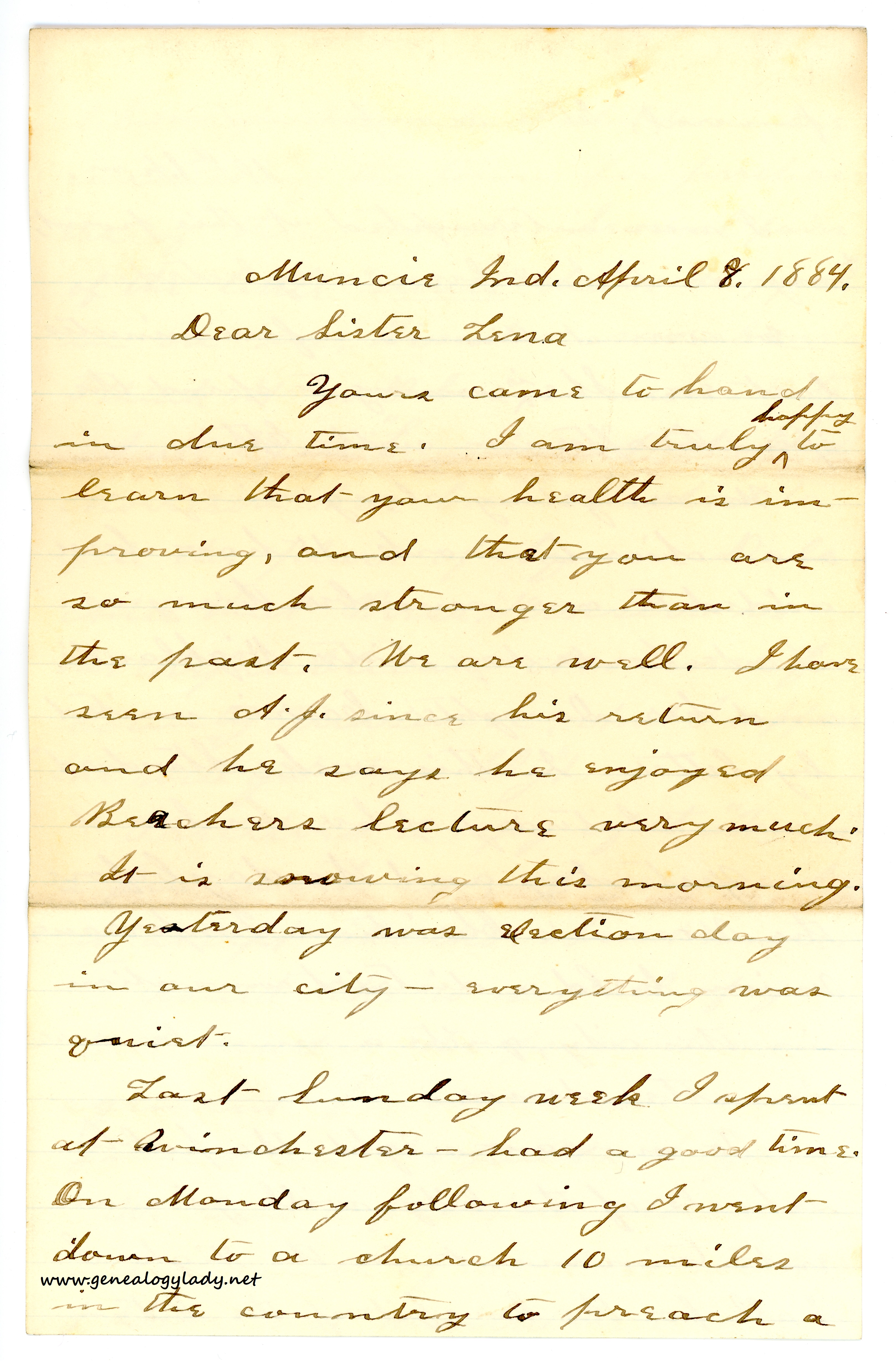 I was at Muncie Saturday morning and learned from Minnie that little Clara was no better when she was down—How is she? Tell me all about her. Minnie also stated that the baby is awful good. How is She? We would like to see them—and all the folks. Ettie says every few days, that she wishes she lived where she could come up and spend the day frequently.