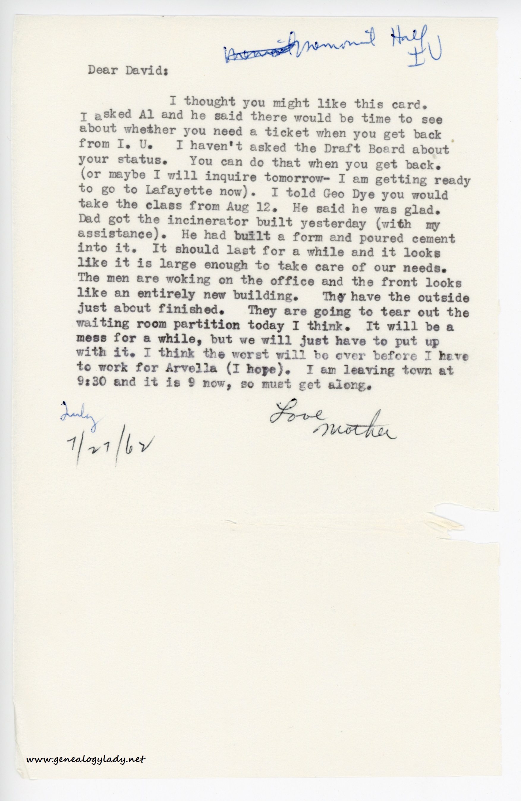 Your Mother’s Day gift received Saturday afternoon. I listened to two records Sunday morning before I went to Sunday school, then in the afternoon I listened to the rest of the opera. I think the music is just beautiful. According to the information with the album that opera is considered the composer’s best. Thanks, you couldn’t have given me anything I enjoyed more. Dad had the Goodland florist make me a corsage. One orchid with three pink rose buds. I just should have some place to wear it, since I just had a chance to show it off once. Mark and his family remembered me with a card and I doubt that brother John even knew it was Mother’s day. I think he has probably forgotten most of the things like that. I still haven’t had an answer from my letters asking him to let me know if he is going to be home and when. I finally gave the girls their vacation dates. One is to be gone June 9 thru 23. The other August 18 thru 31. Edna had a dental appointment this past week and was told she should have her teeth pulled. She plan[s] to have that done while she is on vacation. Not a very pleasant thing to look forward to for vacation. Dad has been having some teeth trouble. He is going to see Dr. Logan tonight. I talked to Geo. Dye last week and he said he knew you were planning to be home this summer and he plans to let you take the Sunday school class. He said Rev. Fields was going to write you about it. Rev. Fields has been having some very informative sermons about John Wesley. I think most of the congregation have been impressed. Of course, there is always the element that can’t be pleased. I have a meeting to attend at the hospital today. I went out last Wednesday and Dr. Gery burned the wart off my little finger. Left quite a hole. It is looking better, but is not entirely healed yet. Week before last, Garnett Janssen’s brother passed away and last week Marge’s father passed away. We attended Mr. Cobb’s funeral yesterday. Dad set out the tuberous begonias and then the weather turned cold. We were fooled by that very warm weather the early part of last week. It is supposed to get into the 70’s today, so maybe the little cold spell hasn’t hurt them. I had to have a new tire put on the car. I just got the car back from the garage and the window in the front door dropped down into the door and I had to have that taken care of. The body man at the garage told me I should have the spots touched up with paint, so one day this week I am going to have that taken care of. I am also going to get a new cover put on the front seat, so my car should take on a new look (for you to wear off this summer). Finally got the new typewriter. I am using it here at home. We kept the old typewriter so when it is necessary to use two typewriters at the office we will have the old one.