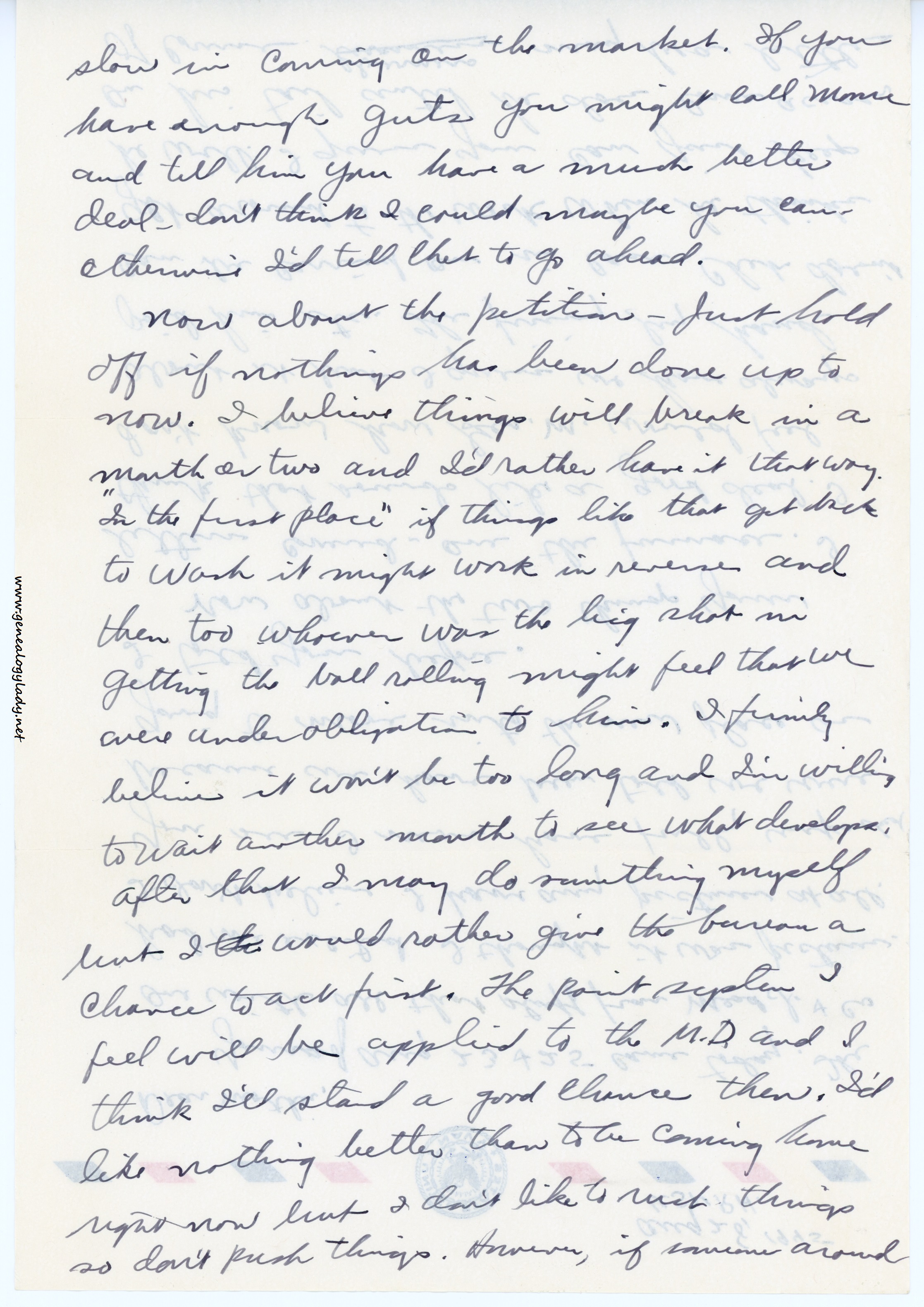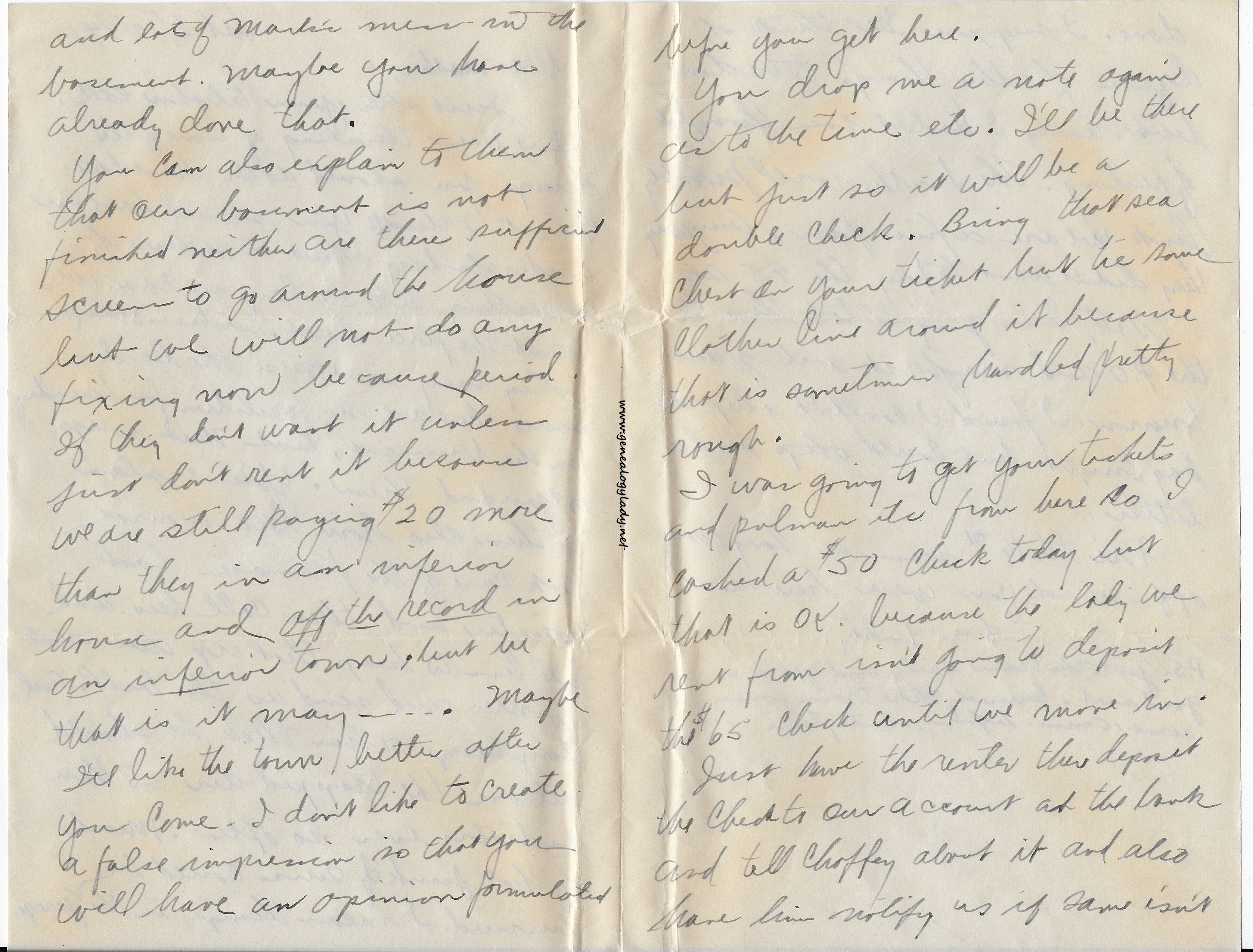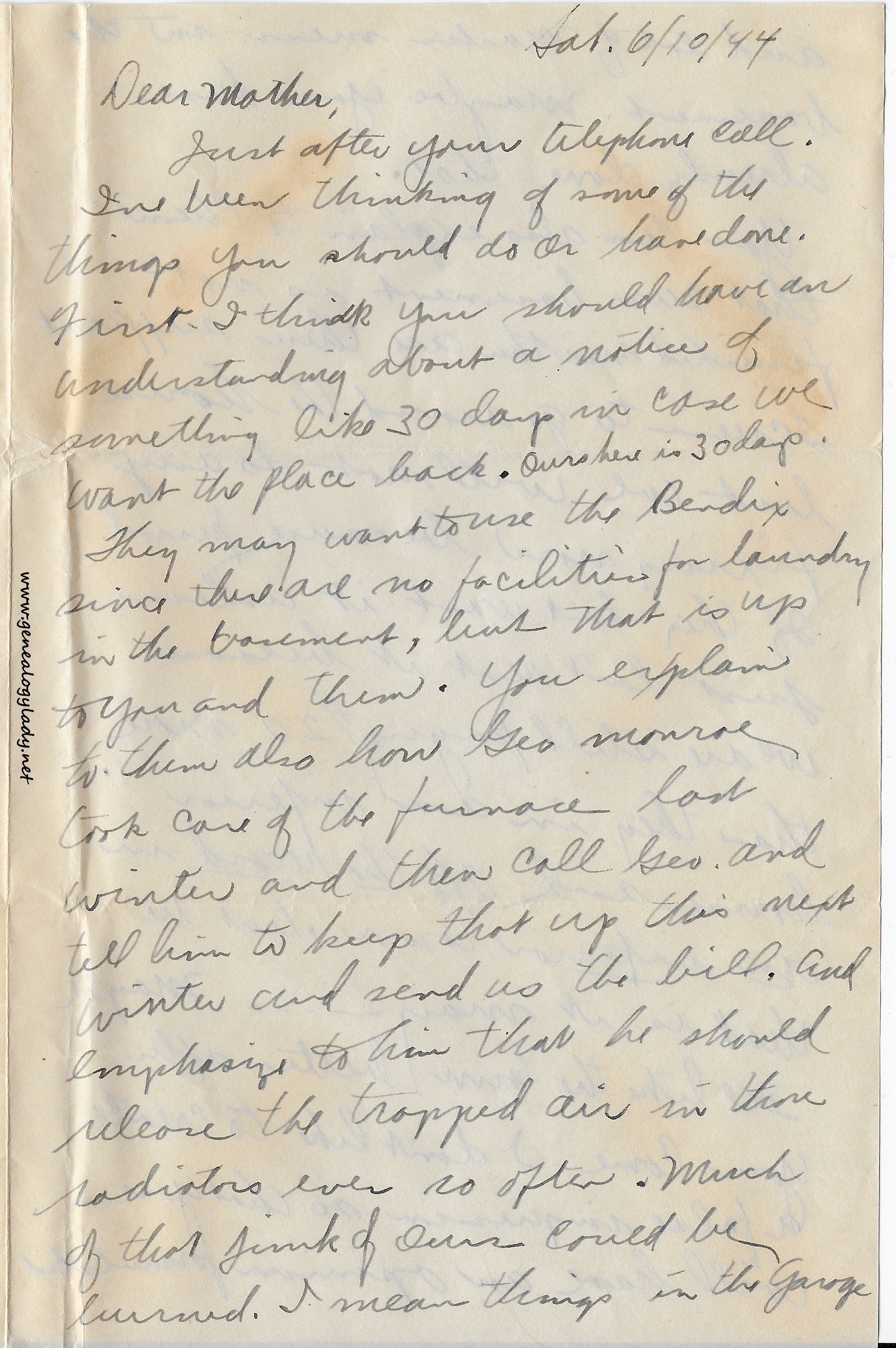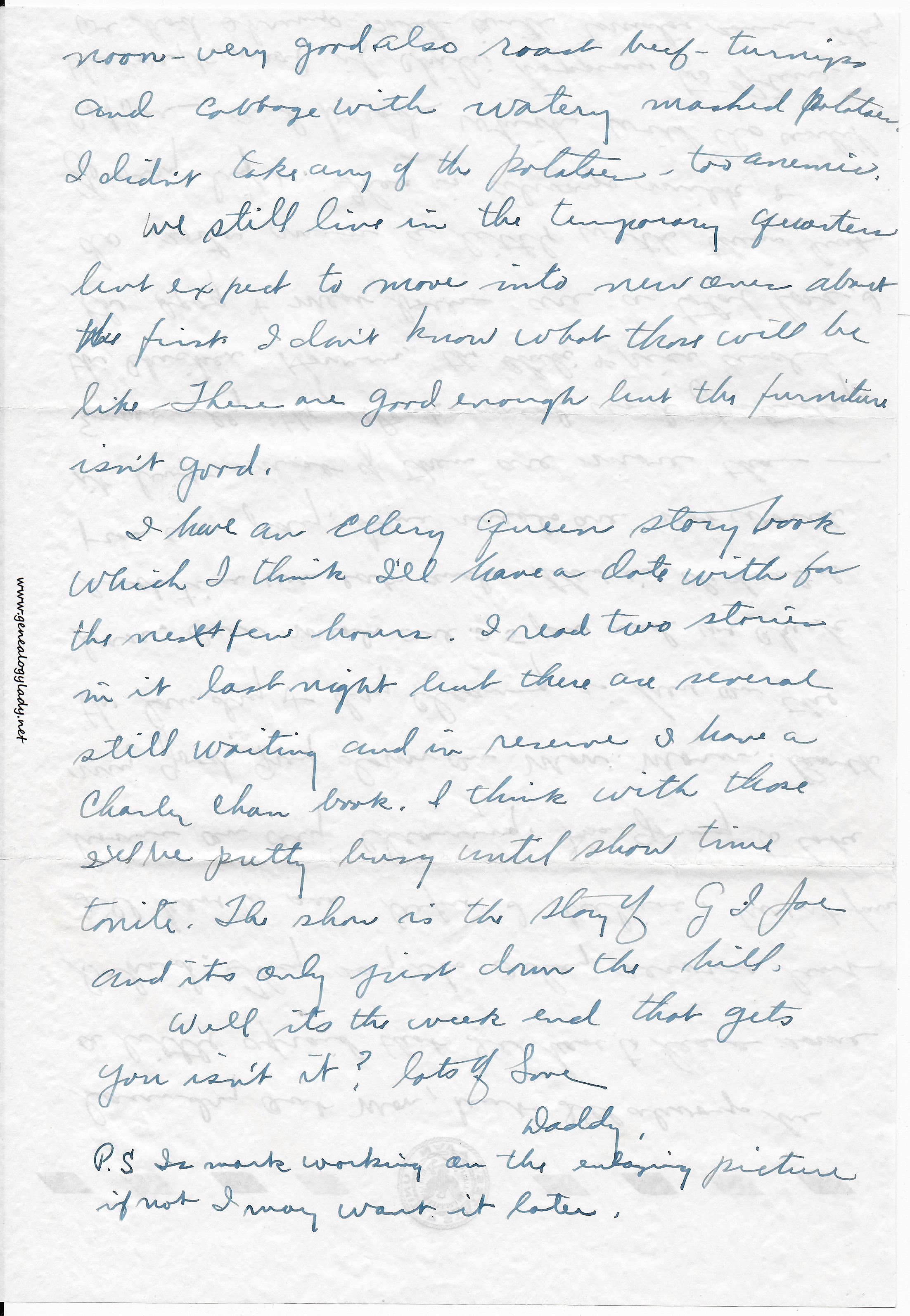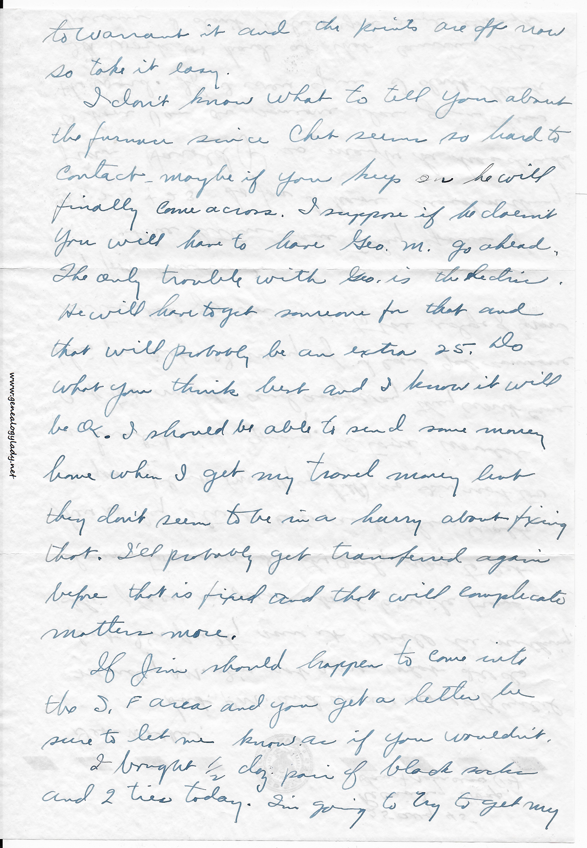 [page 2] back to Mildred but she won’t be back for two more weeks and my hair gets more uncurly every day. I read the boys part of your letter with the “pun” about the frames and you can guess their reaction. It wasn’t exactly complimentary to your humor, but you know our boys.