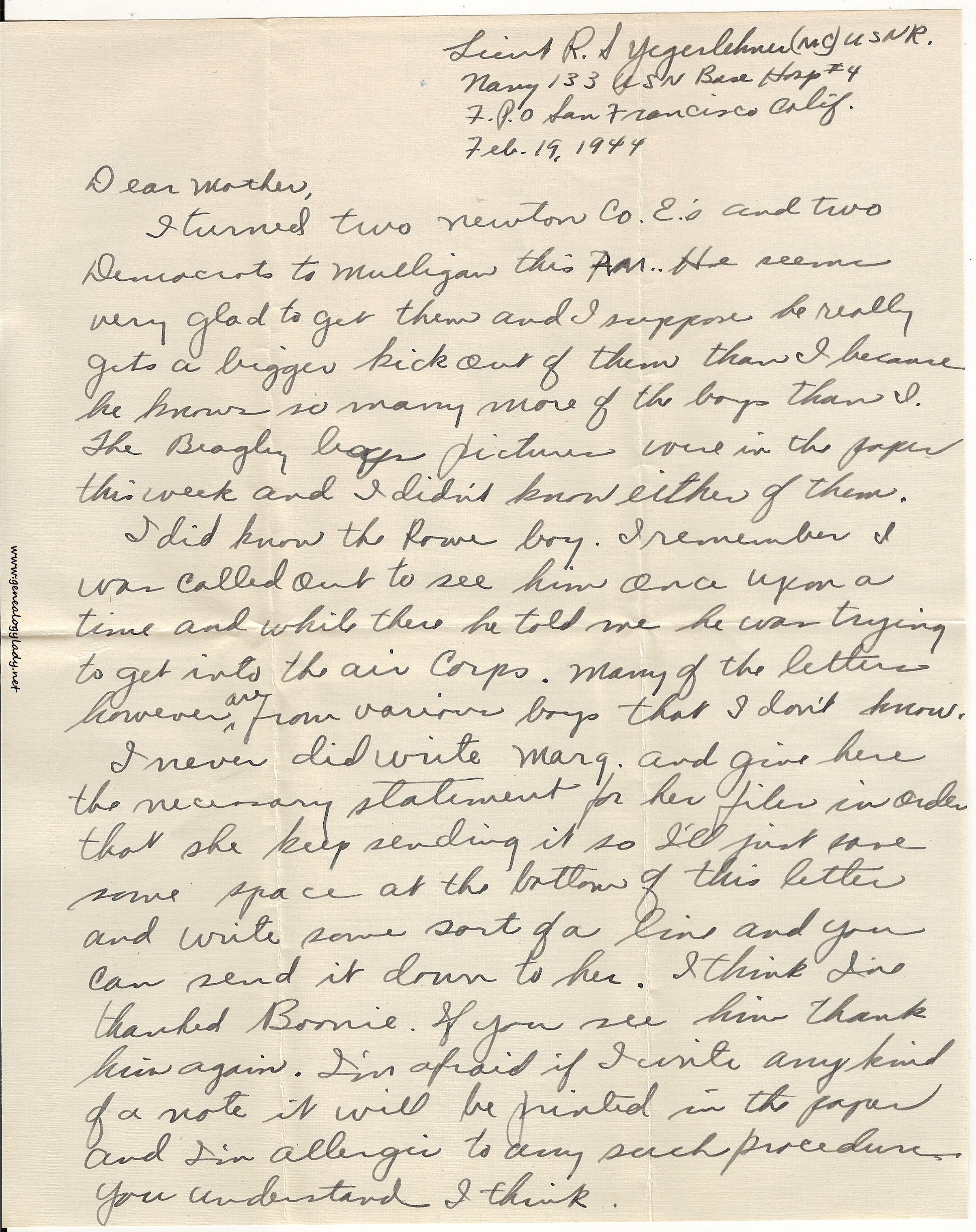I turned two Newton Co. E.’s and two Democrats to Mulligan this AM. He seems very glad to get them and I suppose he really gets a bigger kick out of them than I because he knows so many more of the boys than I. The Beagley boys’ pictures were in the paper this week and I didn’t know either of them.