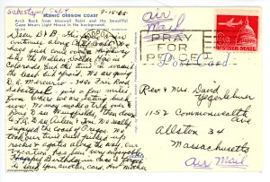 Dear D. & B. This same view continues along Calif. coast. We have just come over a highway like the Million Dollar Hwy in Colorado but this time I wasn’t the least bit afraid. We are going D.A. Mercurio – 3490 Frei Road Sebastapol—just a few miles from where we are eating back now. We may make a trip over to Reno to see Wingfields, then down to L.A. to see Aileen & Tom. We really enjoyed the coast of Oregon. We took our time and picked up rocks & agates along the way. Our vacation has been very enjoyable. Happy Birthday in case I forget to send you another card. Love Mother