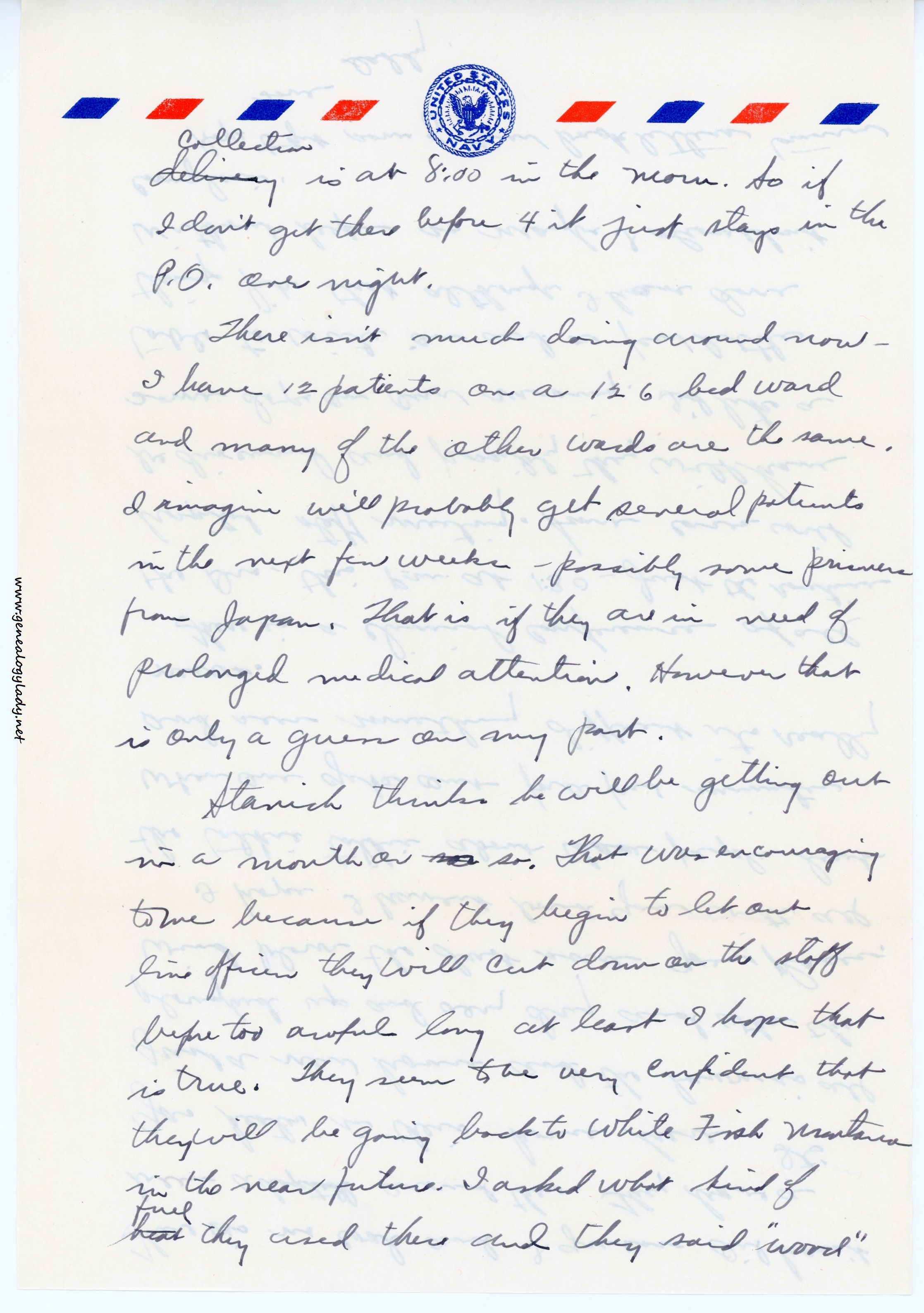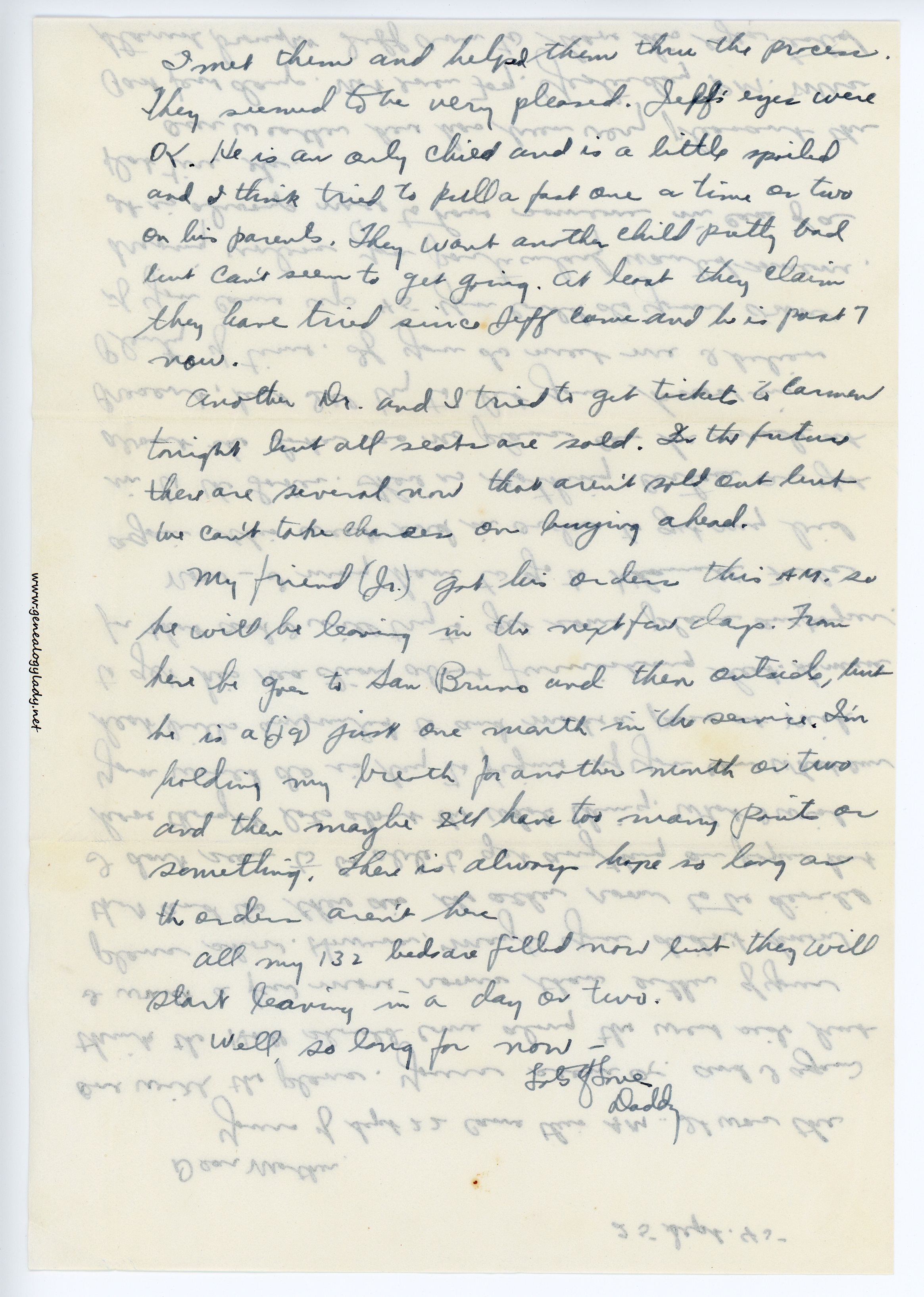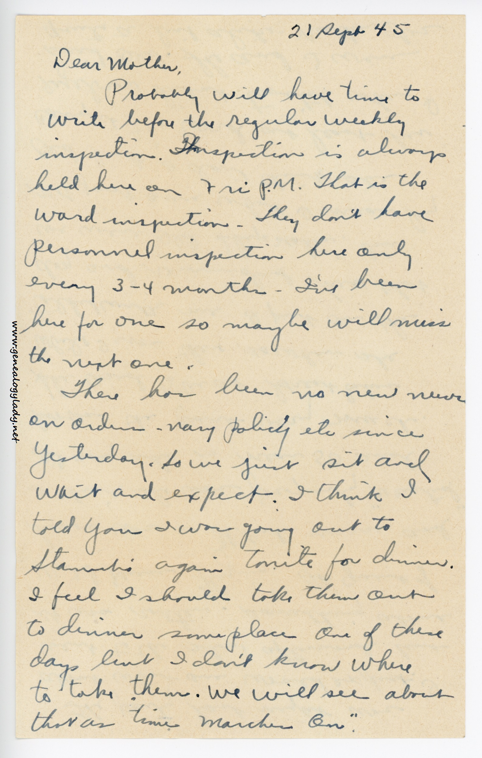 [page 2] I think the whole thing for the blues will cost $4.00. I’m also going to try to find out a little more definite about the Nov. 1 date for the discharge. Yes, I haven’t forgotten that that is your birthday, but I’m practically certain I won’t be home by that date.