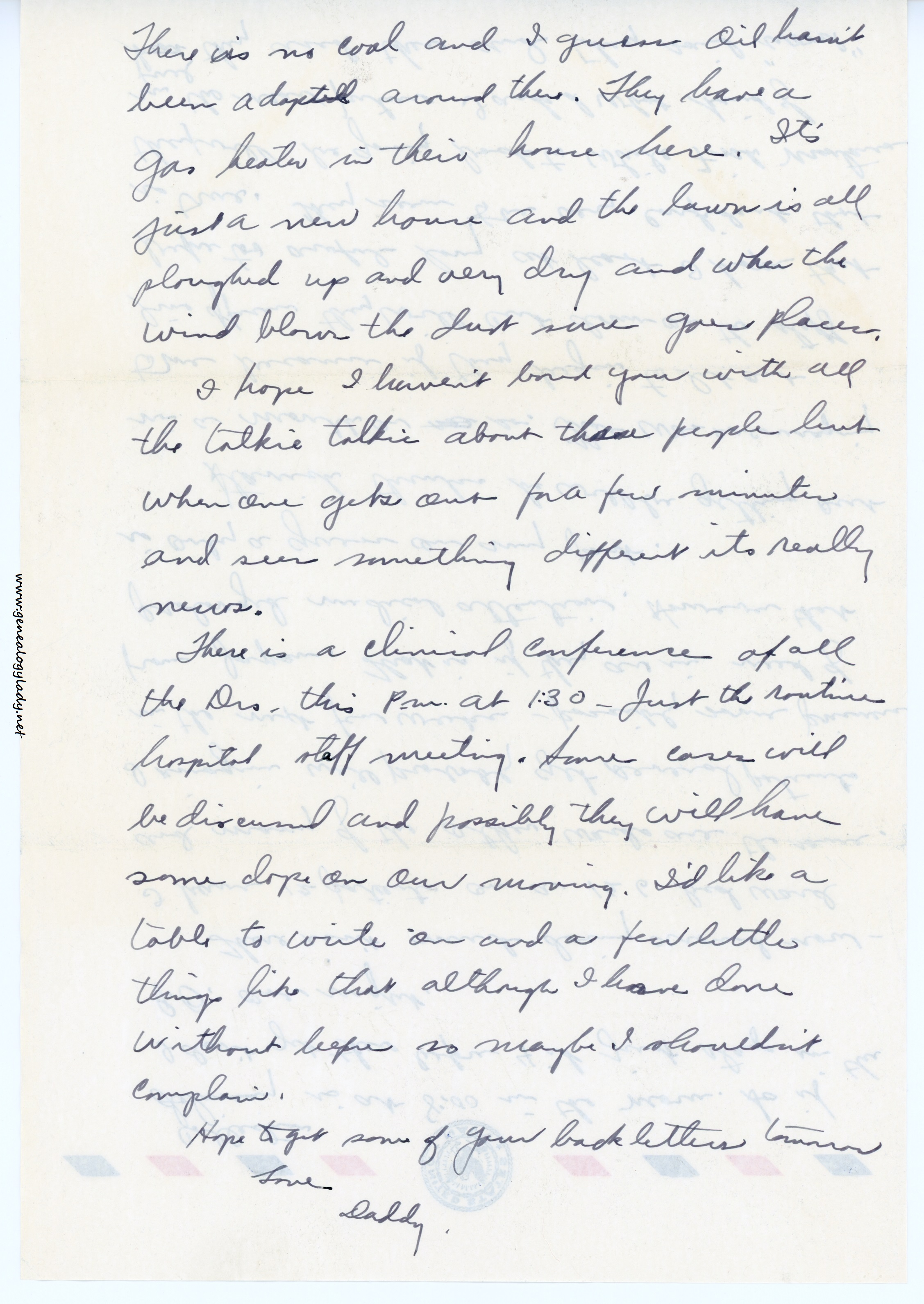 I think we discussed this before but just in case – I don’t believe I’d have a thing done to the back room on the other side until I get home. Those rooms we have there if finished properly will be sufficient for the time being, but again don’t fuss and stew, because it won’t take long when I get there and a couple of weeks won’t make much difference in years.