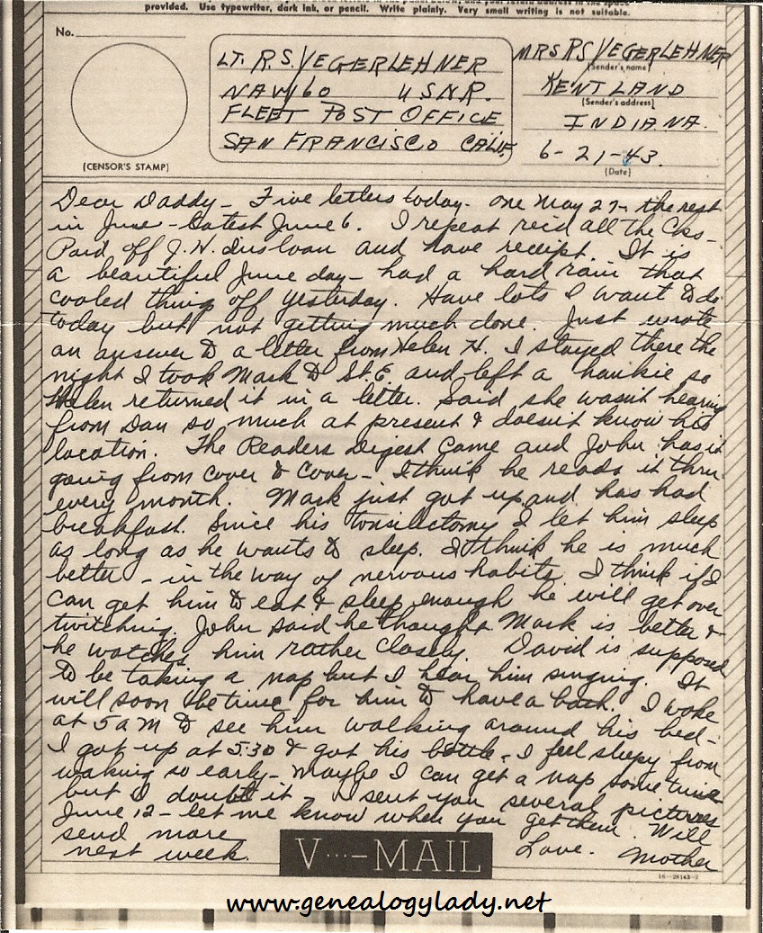 Got three letters yesterday all v-mail dated the latter part of Mar. Mar 27 was the latest – Mark’s letter (air mail) of Mar 30 was the last received in it came 2-3 days ago.
