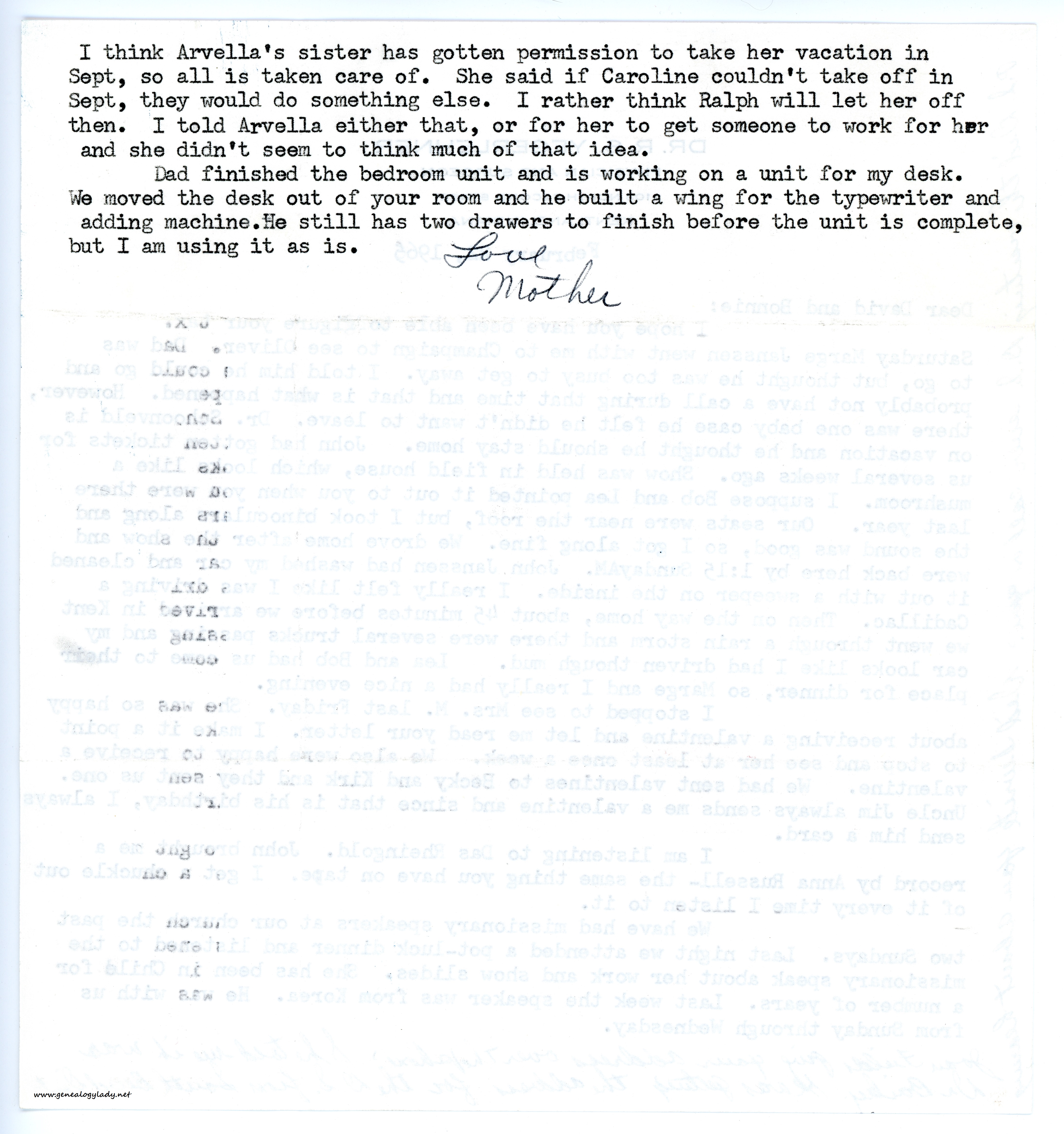 1965-02-22-gry-p-2[page 2] I think Arvella’s sister has gotten permission to take her vacation in Sept., so all is taken care of. She said if Caroline couldn’t take off in Sept., they would do something else. I rather think Ralph will let her off then. I told Arvella either that, or for her to get someone to work for her and she didn’t seem to think much of that idea.