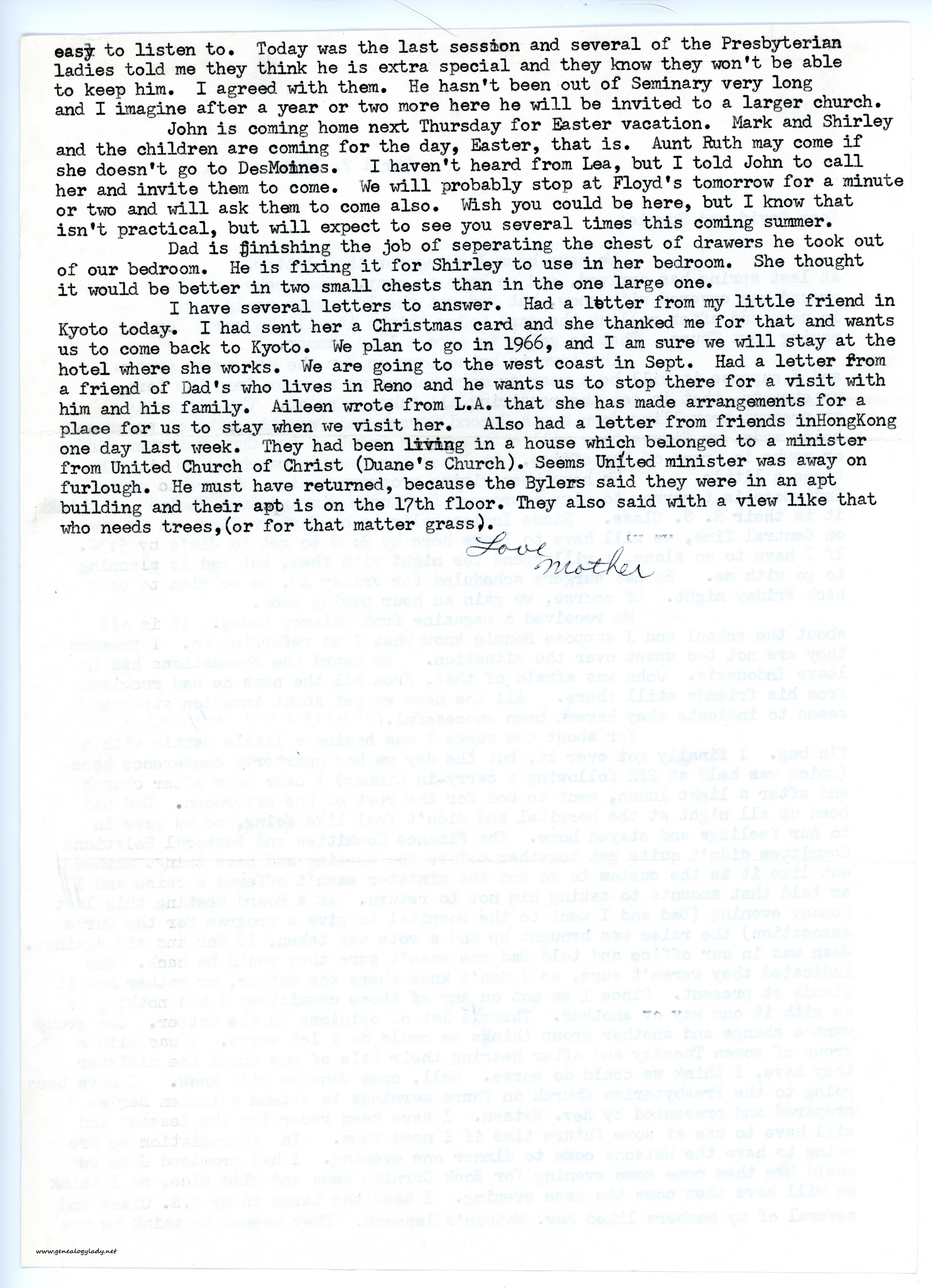 1965-04-07-gry-p-2[page 2] easy to listen to. Today was the last session and several of the Presbyterian ladies told me they think he is extra special and they know they won’t be able to keep him. I agreed with them. He hasn’t been out of Seminary very long and I imagine after a year or two more here he will be invited to a larger church.