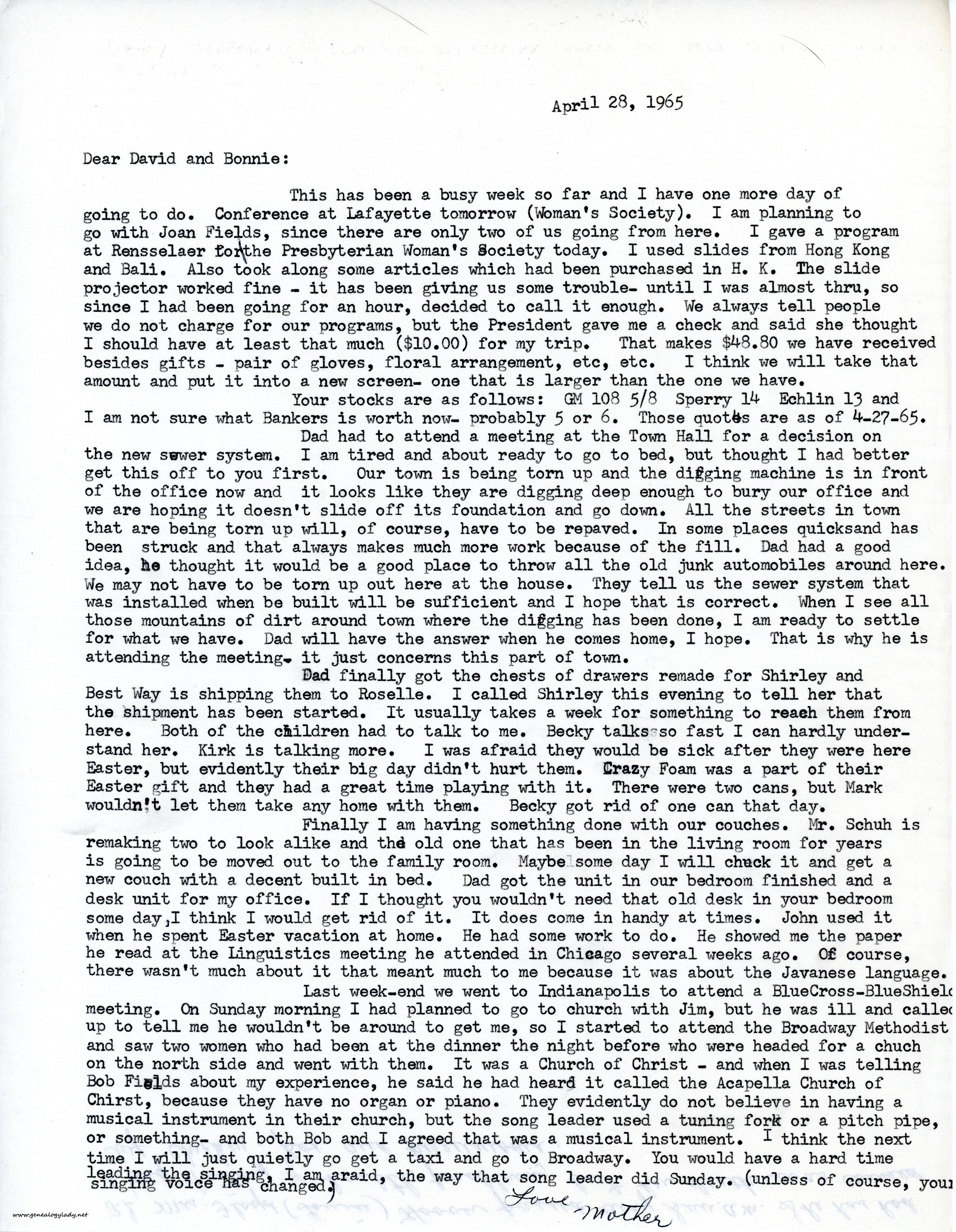 1965-04-28-gry-p-2Last weekend we went to Indianapolis to attend a BlueCross-Blue Shield meeting. On Sunday morning I had planned to go to church with Jim, but he was ill and called up to tell me he wouldn’t be around to get me, so I started to attend the Broadway Methodist and saw two women who had been at the dinner the night before who were headed for a church on the north side and went with them. It was a Church of Christ—and when I was telling Bob Fields about my experience, he said he had heard it called the Acapella Church of Christ, because they have no organ or piano. They evidently do not believe in having a musical instrument in their church, but the song leader used a tuning fork or a pitch pipe, or something—and both Bob and I agreed that was a musical instrument. I think the next time I will just quietly go get a taxi and go to Broadway. You would have a hard time leading the singing, I am afraid, the way that song leader did Sunday (unless of course, your singing voice has changed).