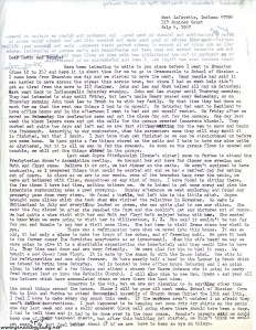 Up at about 6:30—had breakfast, shaved, loaded the car—left Centerville after 9:00, but stop in Richmond to buy film—so we didn’t get into Ohio until about 10:00. But we were to the other side of Columbus by 12:00. Stopped for lunch at the first rest area east of Columbus. We were on the road again by 1:00. Made good time—arrived in Wheeling, W.V., about 3:00. Stopped at the Fostoria Glass outlet, bought one piece; headed on to Pittsburgh—arrived at Lee and Mary [???] apartment about 5:00. Unloaded the car; had supper. Visited. About 8:00 we all went out to see the city. Drove to several places, especially to outlook points. Took some pictures. About 10:00 we came back to the apartment. We visited, then showed a few of our slides to show the difference between instamatic camera + ours. Bathed; off to bed about 12:30.