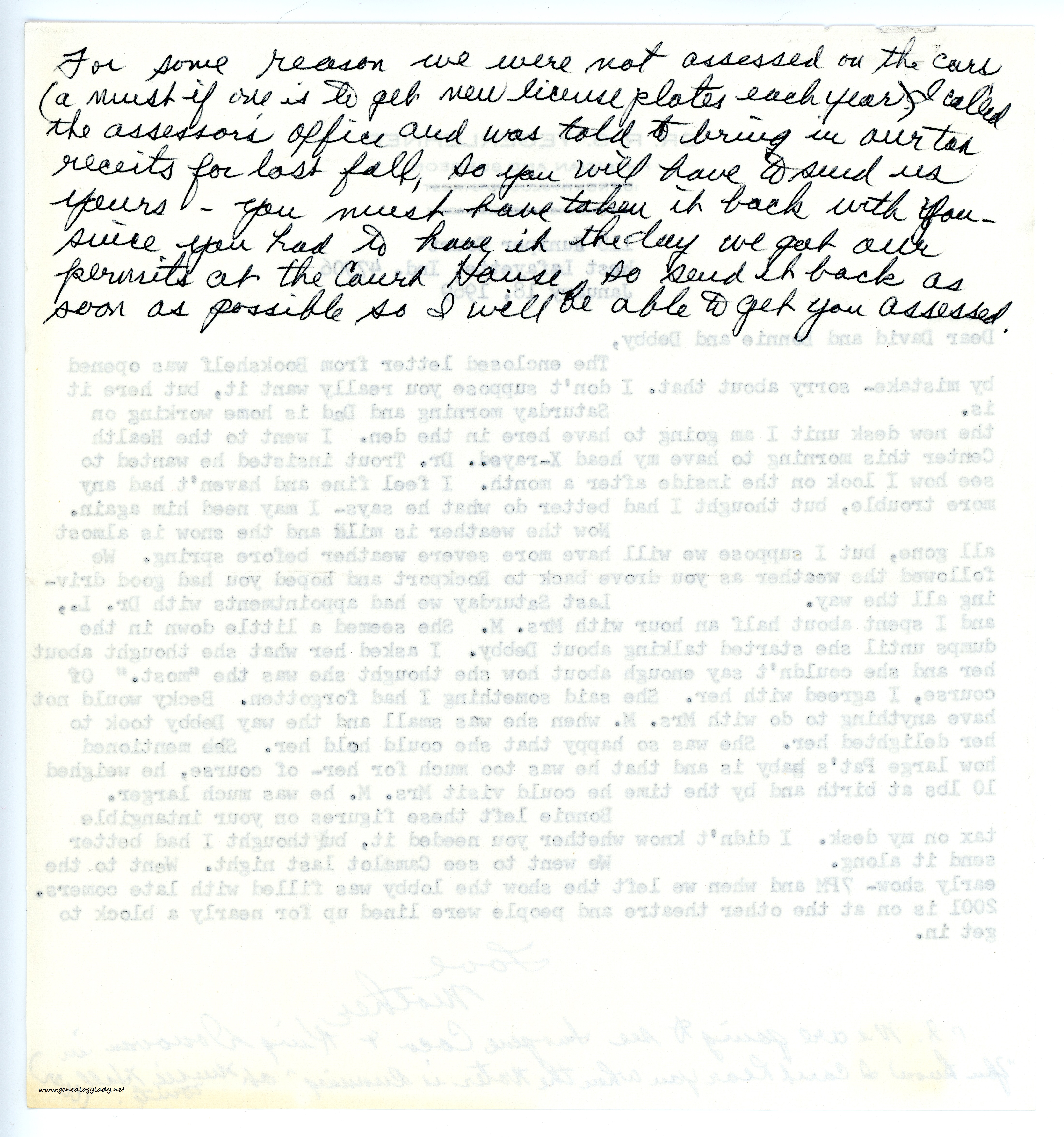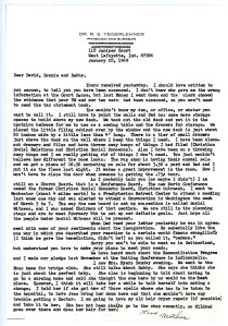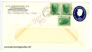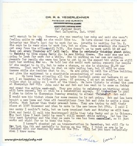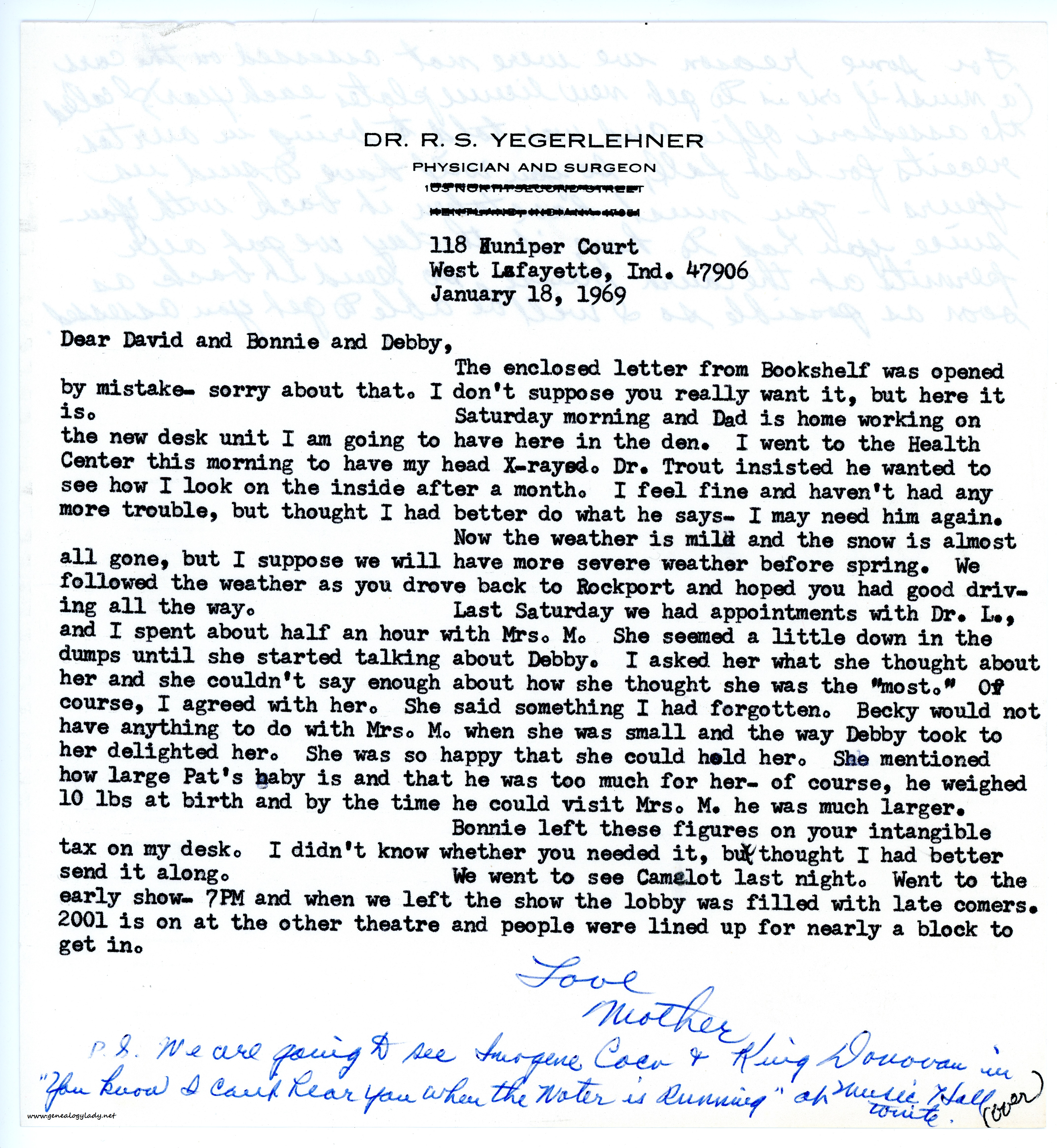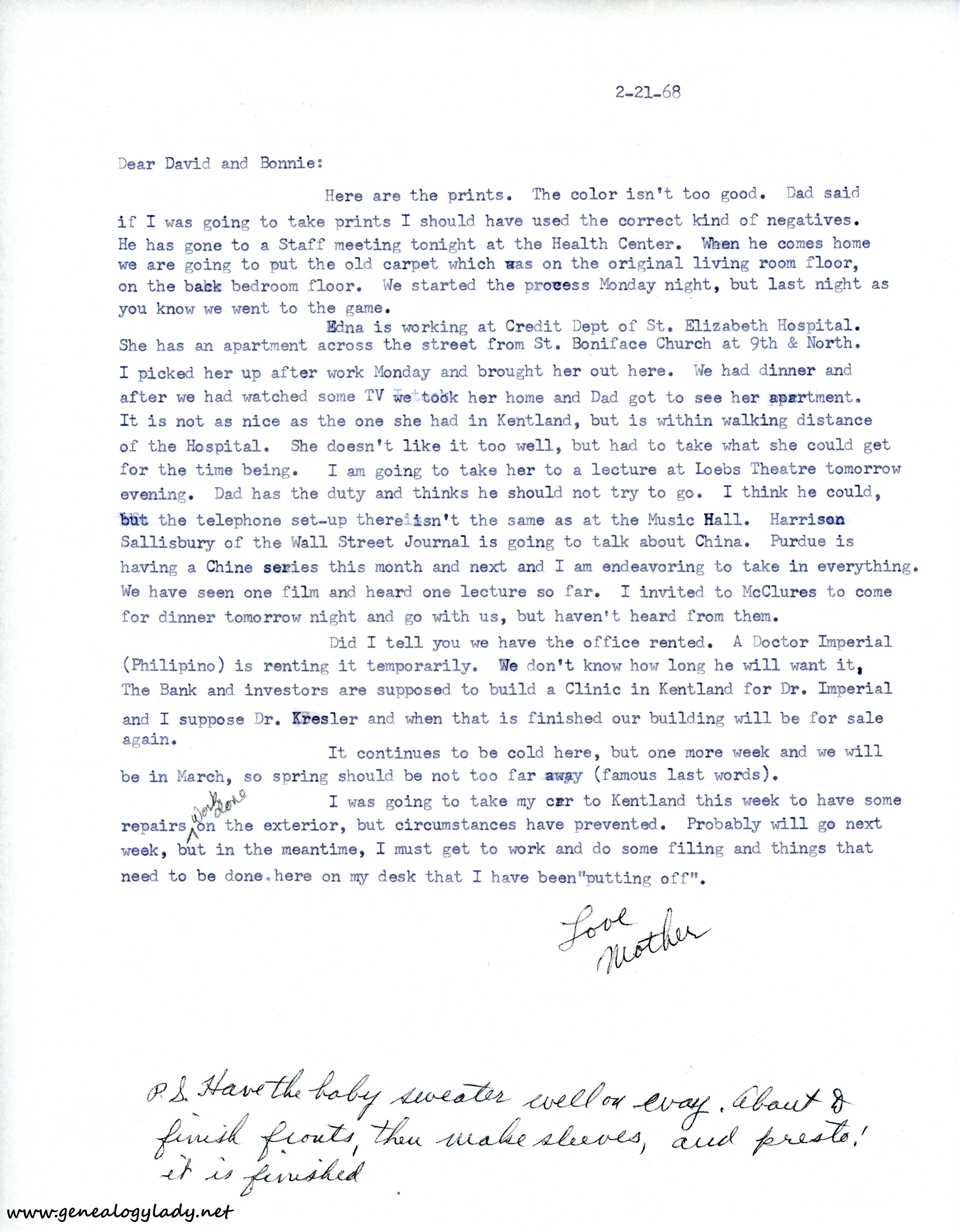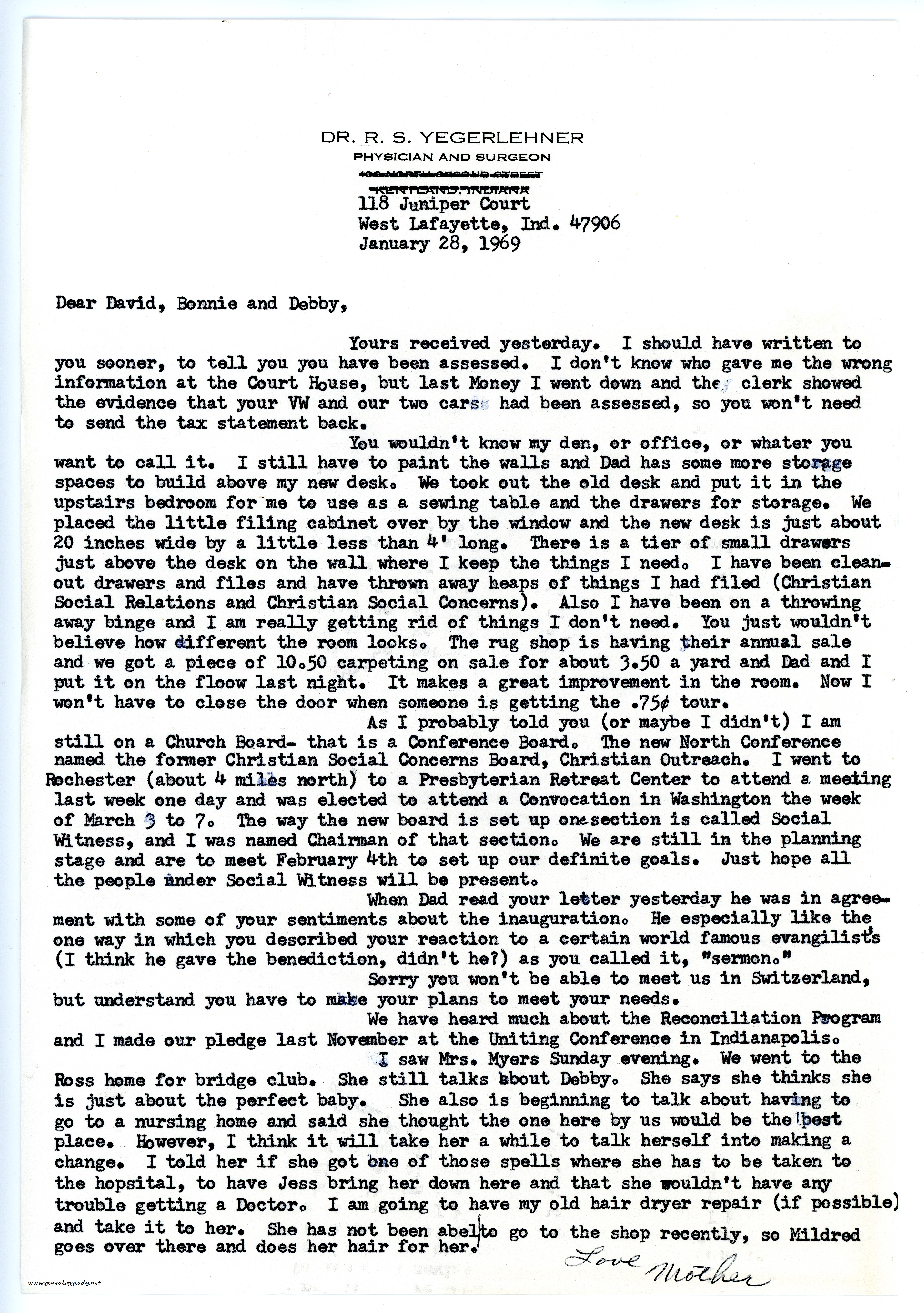 Have been looking for Don’s address, but can’t find it. Will get it from his sister Annie Mishler—she is taking training at St. E. and her husband is in school at Purdue. Will call her soon and get the address.—Just looked and looked in my filing cabinet for my Christmas list and couldn’t find it under C where I always file it. Resumed this letter and happened to see a clip board that has been on my desk since Christmas and the thought suddenly occurred to me that my missing list wasn’t missing, but just at my finger tips. The address is Rev. Donald Yegerlehner, 2305½ Sand Point Road, Ft. Wayne, Ind. 46807. I think he has the title of Rev. After graduating from Purdue with a 6 point (the highest) he went to Minnesota for a year or two and took Theology. He is now doing social service with a church in Fort Wayne.
