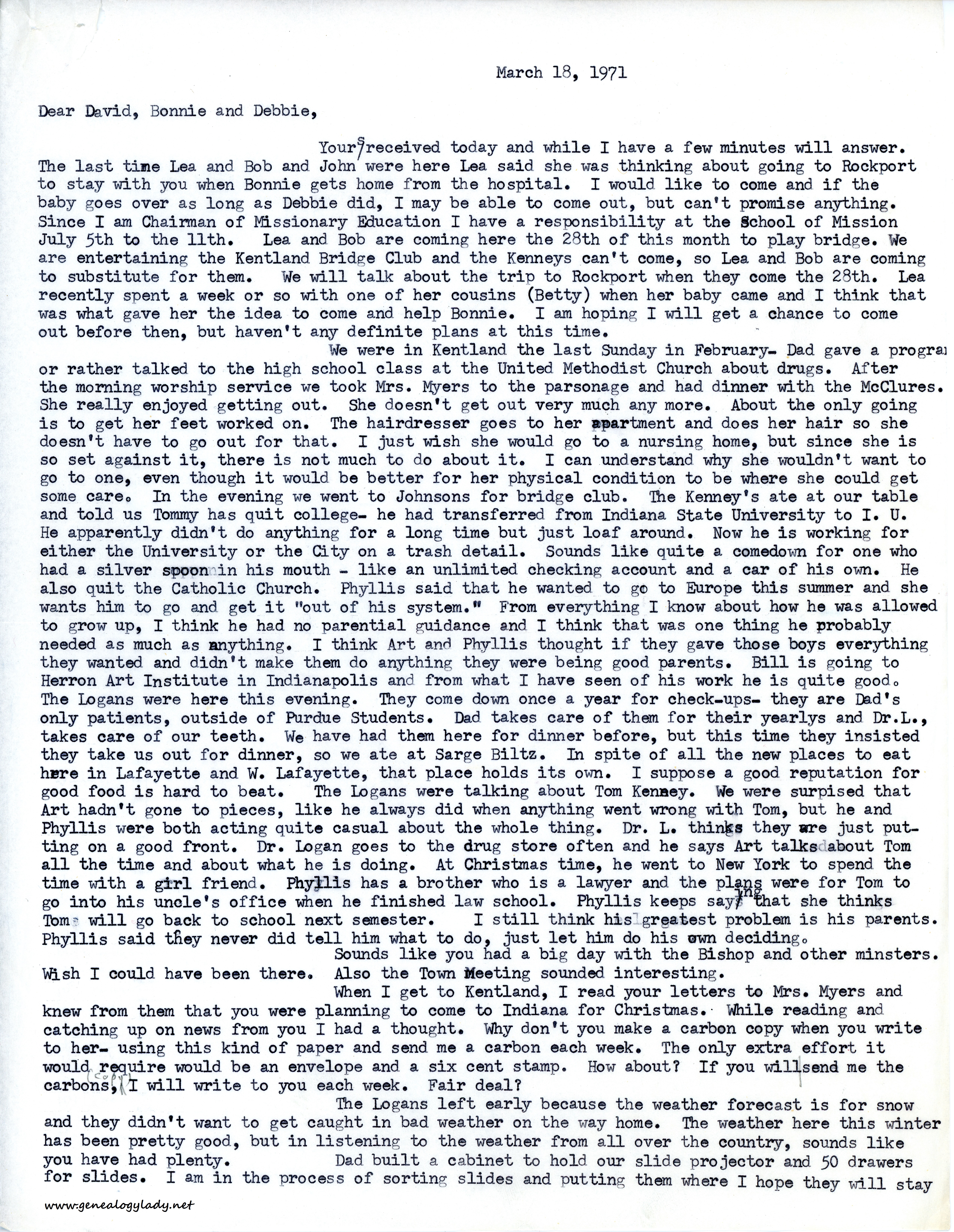 We were in Kentland the last Sunday in February—Dad gave a program or rather talked to the high school class at the United Methodist Church about drugs. After the morning worship service we took Mrs. Myers to the parsonage and had dinner with the McClures. She really enjoyed getting out. She doesn’t get out very much anymore. About the only going is to get her feet worked on. The hairdresser goes to her apartment and does her hair so she doesn’t have to go out for that. I just wish she would go to a nursing home, but since she is so set against it, there is not much to do about it. I can understand why she wouldn’t want to go to one, even though it would be better for her physical condition to be where she could get some care. In the evening we went to Johnsons for bridge club. The Kenney’s ate at our table and told us Tommy has quit college—he had transferred from Indiana State University to I.U. He apparently didn’t do anything for a long time but just loaf around. Now he is working for either the University or the City on a trash detail. Sounds like quite a comedown for one who had a silver spoon in his mouth—like an unlimited checking account and a car of his own. He also quit the Catholic Church. Phyllis said that he wanted to go to Europe this summer and she wants him to go and get it “out of his system.” From everything I know about how he was allowed to grow up, I think he had no parental guidance and I think that was one thing he probably needed as much as anything. I think Art and Phyllis thought if they gave those boys everything they wanted and didn’t make them do anything they were being good parents. Bill is going to Herron Art Institute in Indianapolis and from what I have seen of his work he is quite good. The Logans were here this evening. They came down once a year for check-ups—they are Dad’s only patients, outside of Purdue Students. Dad takes care of them for their yearlys and Dr. L., takes care of our teeth. We have had them here for dinner before, but this time they insisted they take us out for dinner, so we ate at Sarge Biltz. In spite of all the new places to eat here in Lafayette and W. Lafayette, that place holds its own. I suppose a good reputation for good food is hard to beat. The Logans were talking about Tom Kenney. We were surprised that Art hadn’t good to pieces, like he always did when anything went wrong with Tom, but he and Phyllis were both acting quite casual about the whole thing. Dr. L. thinks they are just putting on a good front. Dr. Logan goes to the drug store often and he says Art talks about Tom all the time and about what he is doing. At Christmas time, he went to New York to spend the time with a girl friend. Phyllis has a brother who is a lawyer and the plans were for Tom to go into his uncle’s office when he finished law school. Phyllis keeping saying that she thinks Tom will go back to school next semester. I still think his greatest problem is his parents. Phyllis said they never did tell him what to do, just let him do his own deciding.