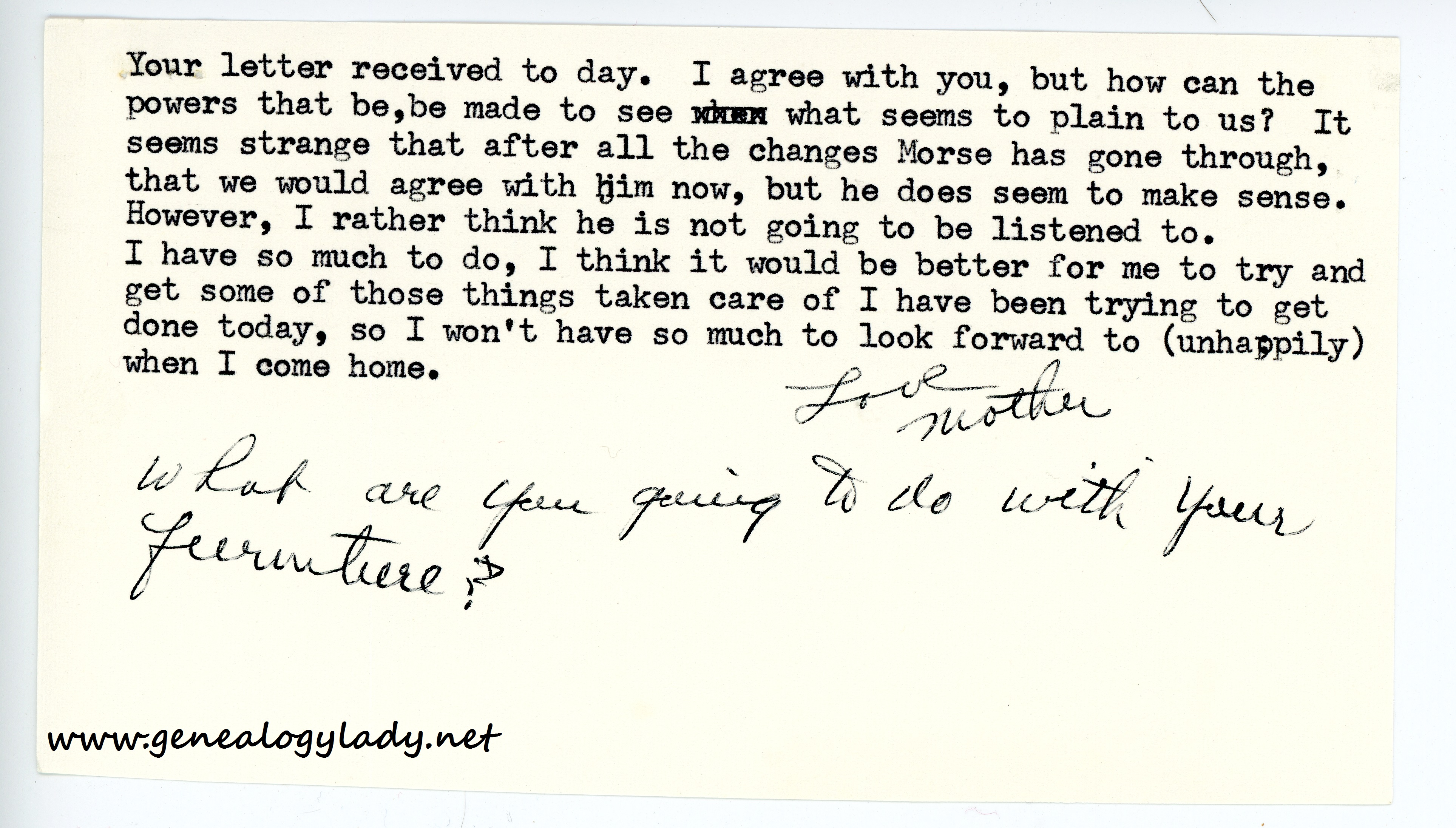 [page 2] and thinks she will be married in about a year. Her fiancé is attending Indiana State, but is thinking of transferring to Purdue. Doris has closed her shop and is spending the summer at their cottage on the lake in Monticello. Harold also spends much time there. He has moved his office to the house. Pat was so happy that her mother had quit work. Harold still looks after Mrs. Myers. I told her about the nursing home about a mile from where we live, but can’t get her interested. Dad even made a concession – he said he would take care of her if she would to W. L. She just can’t bring herself to the idea of a nursing home, but I am afraid the time is coming when she won’t be able to stay alone.