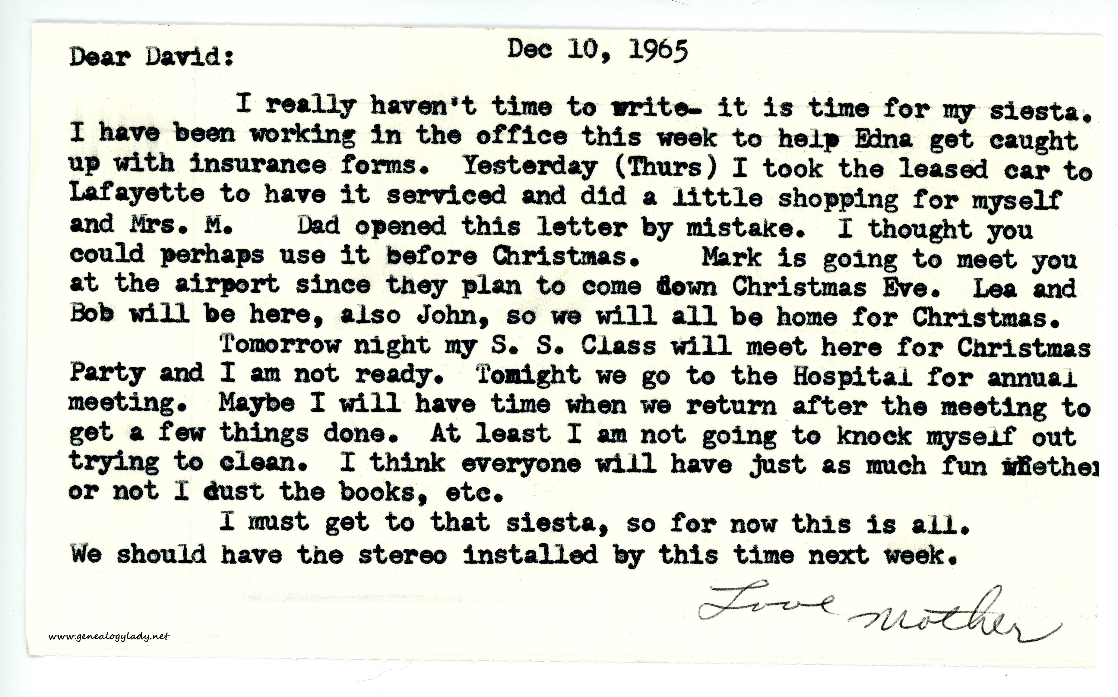 Dad is about to complete the cabinet for the stereo. You may be interested to know that I am keeping my records in the order in which you left them. I have played for my own enjoyment when I am home alone all my Christmas records, except the one Mark and Shirley gave me and John took it and is going to get me something else. After listening to all those, I have started to listen to all my records as you have them stored. I was listening some today, but had the washing machine going and there was too much noise. (I mean the classical ones.)