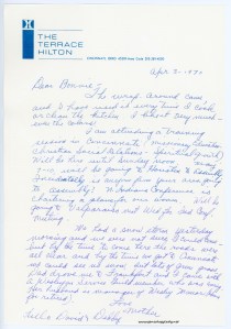 We were in Kentland the last Sunday in February—Dad gave a program or rather talked to the high school class at the United Methodist Church about drugs. After the morning worship service we took Mrs. Myers to the parsonage and had dinner with the McClures. She really enjoyed getting out. She doesn’t get out very much anymore. About the only going is to get her feet worked on. The hairdresser goes to her apartment and does her hair so she doesn’t have to go out for that. I just wish she would go to a nursing home, but since she is so set against it, there is not much to do about it. I can understand why she wouldn’t want to go to one, even though it would be better for her physical condition to be where she could get some care. In the evening we went to Johnsons for bridge club. The Kenney’s ate at our table and told us Tommy has quit college—he had transferred from Indiana State University to I.U. He apparently didn’t do anything for a long time but just loaf around. Now he is working for either the University or the City on a trash detail. Sounds like quite a comedown for one who had a silver spoon in his mouth—like an unlimited checking account and a car of his own. He also quit the Catholic Church. Phyllis said that he wanted to go to Europe this summer and she wants him to go and get it “out of his system.” From everything I know about how he was allowed to grow up, I think he had no parental guidance and I think that was one thing he probably needed as much as anything. I think Art and Phyllis thought if they gave those boys everything they wanted and didn’t make them do anything they were being good parents. Bill is going to Herron Art Institute in Indianapolis and from what I have seen of his work he is quite good. The Logans were here this evening. They came down once a year for check-ups—they are Dad’s only patients, outside of Purdue Students. Dad takes care of them for their yearlys and Dr. L., takes care of our teeth. We have had them here for dinner before, but this time they insisted they take us out for dinner, so we ate at Sarge Biltz. In spite of all the new places to eat here in Lafayette and W. Lafayette, that place holds its own. I suppose a good reputation for good food is hard to beat. The Logans were talking about Tom Kenney. We were surprised that Art hadn’t good to pieces, like he always did when anything went wrong with Tom, but he and Phyllis were both acting quite casual about the whole thing. Dr. L. thinks they are just putting on a good front. Dr. Logan goes to the drug store often and he says Art talks about Tom all the time and about what he is doing. At Christmas time, he went to New York to spend the time with a girl friend. Phyllis has a brother who is a lawyer and the plans were for Tom to go into his uncle’s office when he finished law school. Phyllis keeping saying that she thinks Tom will go back to school next semester. I still think his greatest problem is his parents. Phyllis said they never did tell him what to do, just let him do his own deciding.