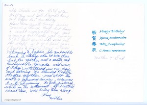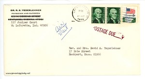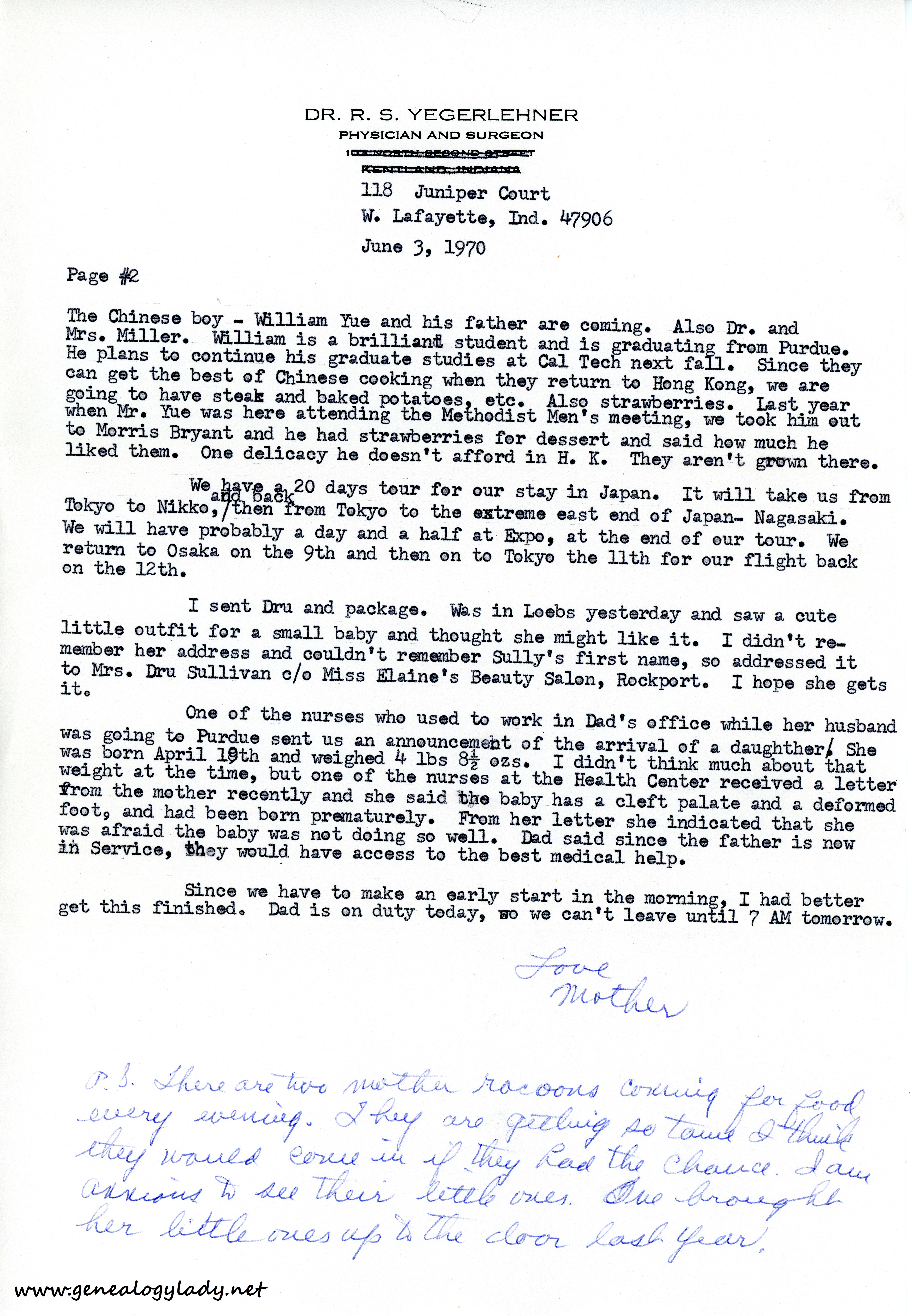 Have been looking for Don’s address, but can’t find it. Will get it from his sister Annie Mishler—she is taking training at St. E. and her husband is in school at Purdue. Will call her soon and get the address.—Just looked and looked in my filing cabinet for my Christmas list and couldn’t find it under C where I always file it. Resumed this letter and happened to see a clip board that has been on my desk since Christmas and the thought suddenly occurred to me that my missing list wasn’t missing, but just at my finger tips. The address is Rev. Donald Yegerlehner, 2305½ Sand Point Road, Ft. Wayne, Ind. 46807. I think he has the title of Rev. After graduating from Purdue with a 6 point (the highest) he went to Minnesota for a year or two and took Theology. He is now doing social service with a church in Fort Wayne.