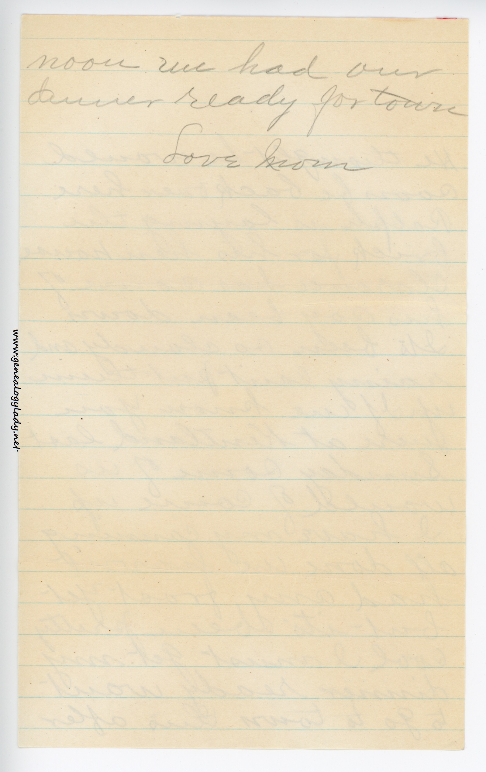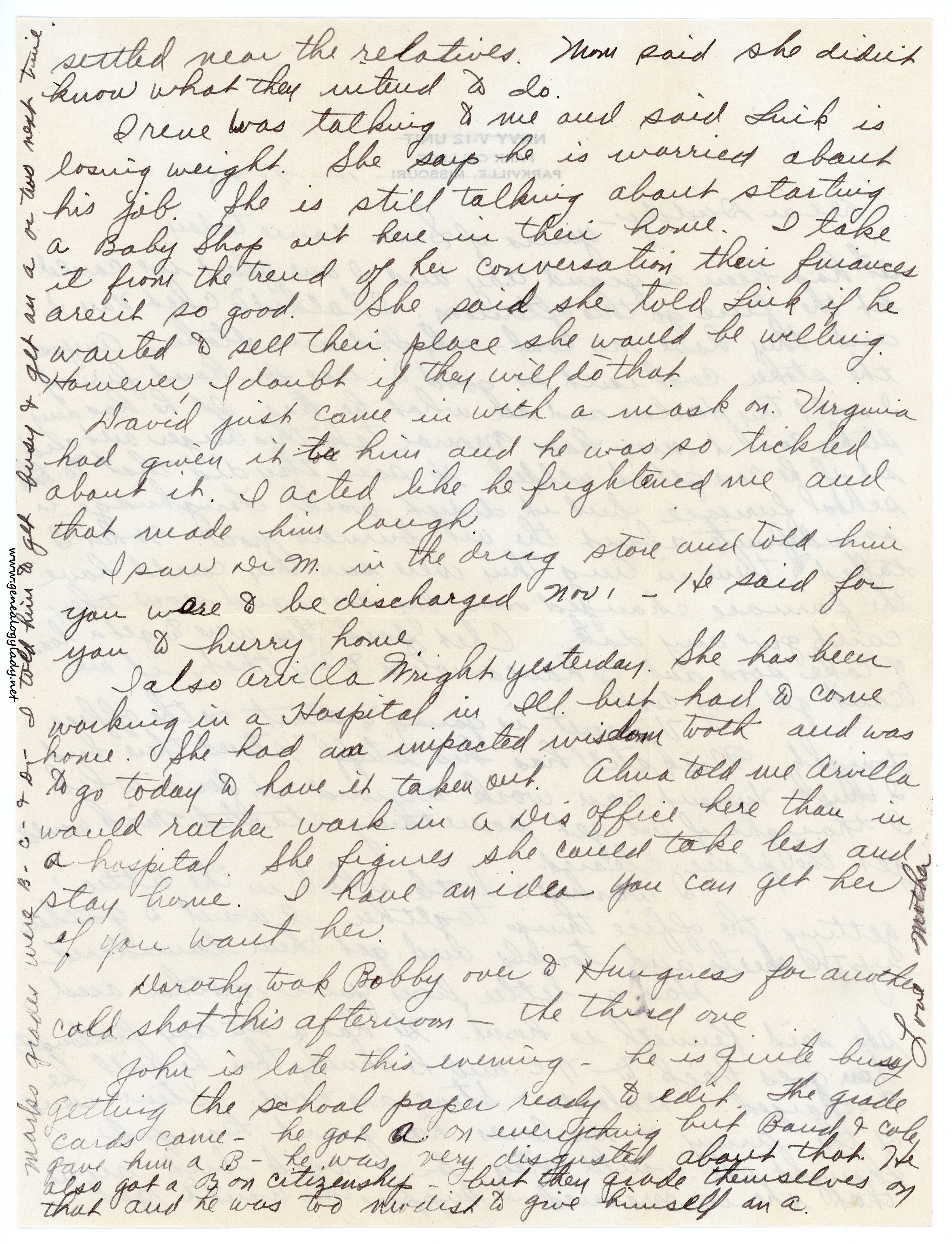 [page 3] to go till this fall sometime she was off so much when she had that itch on her feet and hands we didn’t wash it’s too rainy. Is Mark’s arm all right? – I hope it is I must get to work get the house cleaned up and get dinner I haven’t cleaned any house yet. Maybe I will sometime if I get to feeling better and Pop will help some.