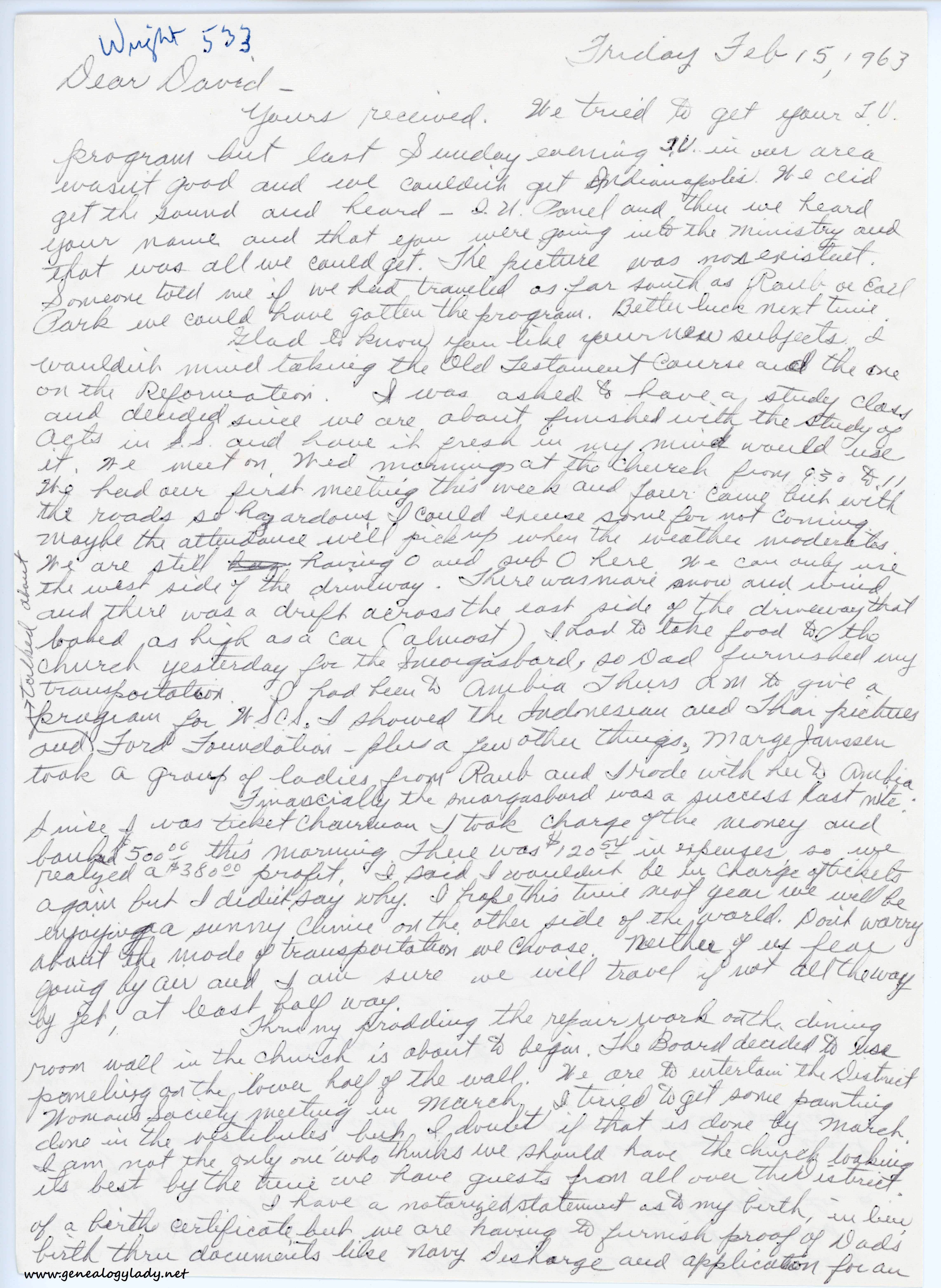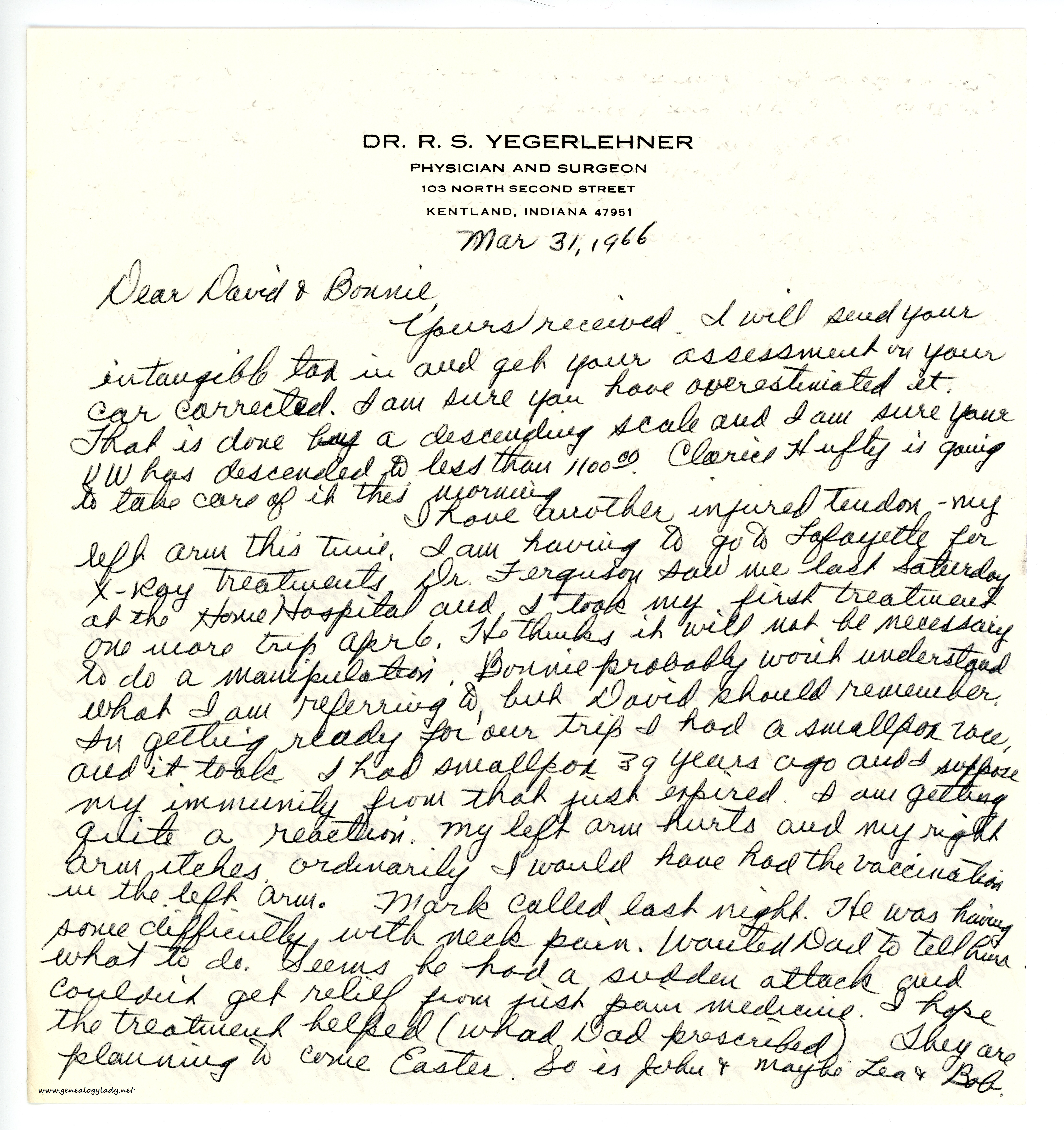 I have another injured tendon—my left arm this time. I am having to go to Lafayette for x-ray treatments. Dr. Ferguson saw me last Saturday at the Home Hospital and I took my first treatment. One more trip Apr. 6. He thinks it will not be necessary to do a manipulation. Bonnie probably won’t understand what I am referring to, but David should remember. In getting ready for our trip I had a smallpox vacc., and it took. I had smallpox 39 years ago and I suppose my immunity from that just expired. I am getting quite a reaction. My left arm hurts and my right arm itches. Ordinarily I would have had the vaccination in the left arm. Mark called last night. He was having some difficulty with neck pain. Wanted Dad to tell him what to do. Seems he had a sudden attack and couldn’t get relief from just pain medicine. I hope the treatment helped (what Dad prescribed). They are planning to come Easter. So is John & maybe Lea & Bob.