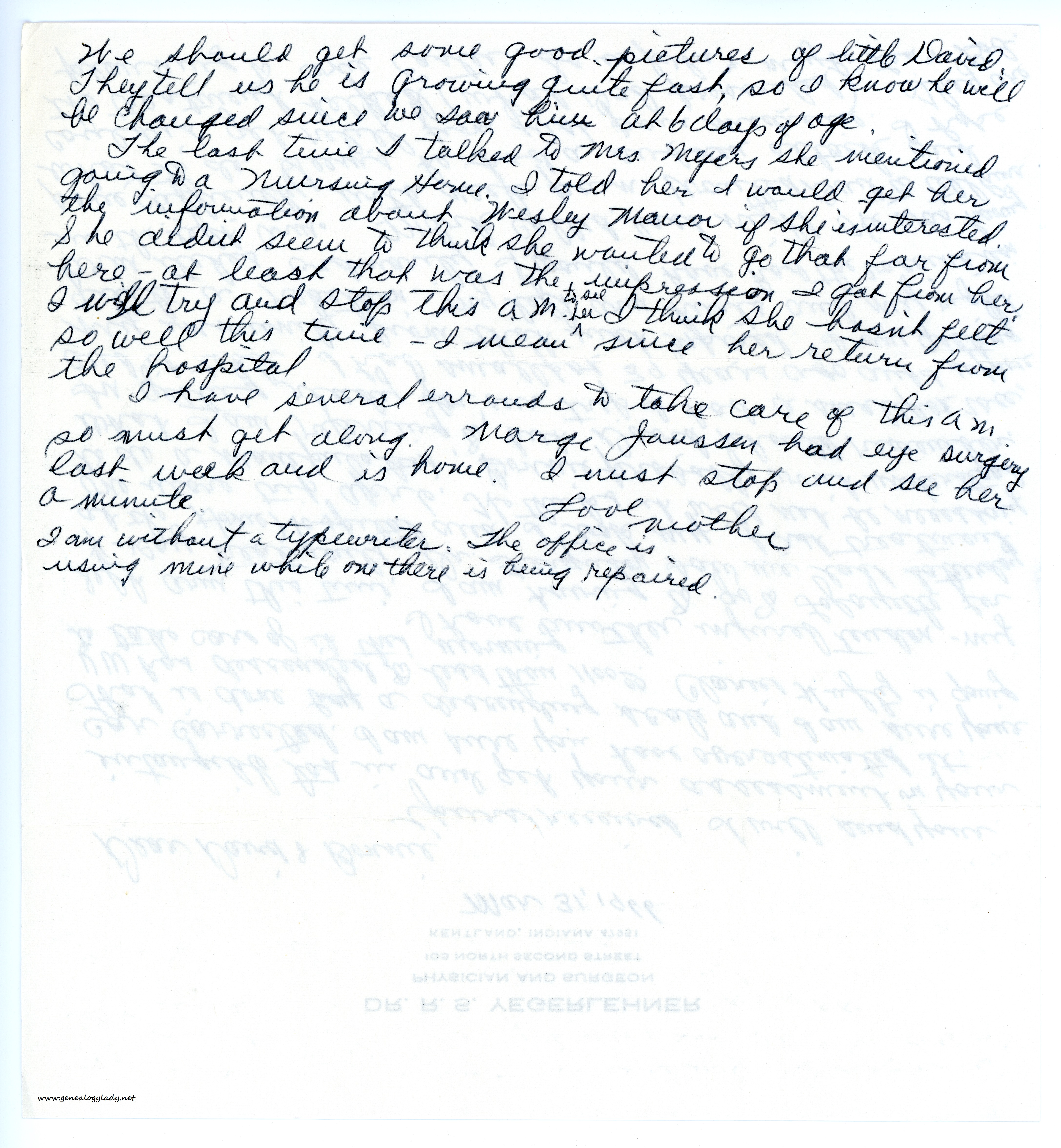 The last time I talked to Mrs. Myers she mentioned going to a nursing home. I told her I would get her the information about Wesley Manor if she is interested. She didn’t seem to think she wanted to go that far from here—at least that was the impression I got from her. I will try and stop this a.m. to see her. I think she hasn’t felt so well this time—I mean since her return from the hospital.