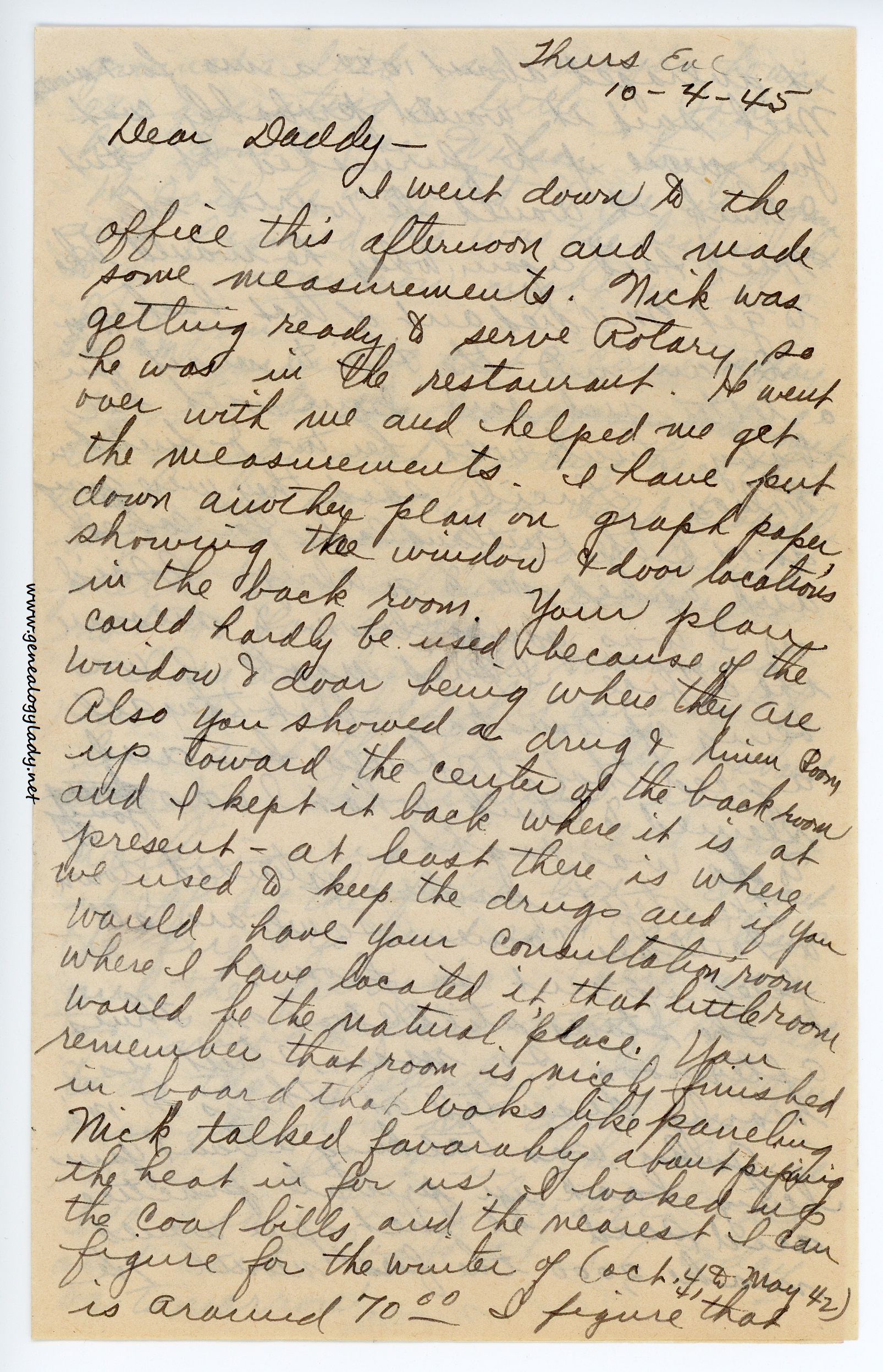 I went down to the office this afternoon and made some measurements. Nick was getting ready to serve Rotary so he was in the restaurant. He went over with me and helped me get the measurements. I have put down another plan on graph paper, showing the window & door locations in the back room. Your plan could hardly be used because of the window & door being where they are. Also you showed a drug & linen room up toward the center of the backroom and I kept it back where it is at present – at least there is where we used to keep the drugs and if you would have your consultation room where I have located it, that little room would be the natural place. You remember that room is nicely finished in board that looks like paneling. Nick talked favorably about piping the heat in for us. I looked up the coal bills and the nearest I can figure for the winter of (Oct. 4. To May 42) is around $70.00. I figure that