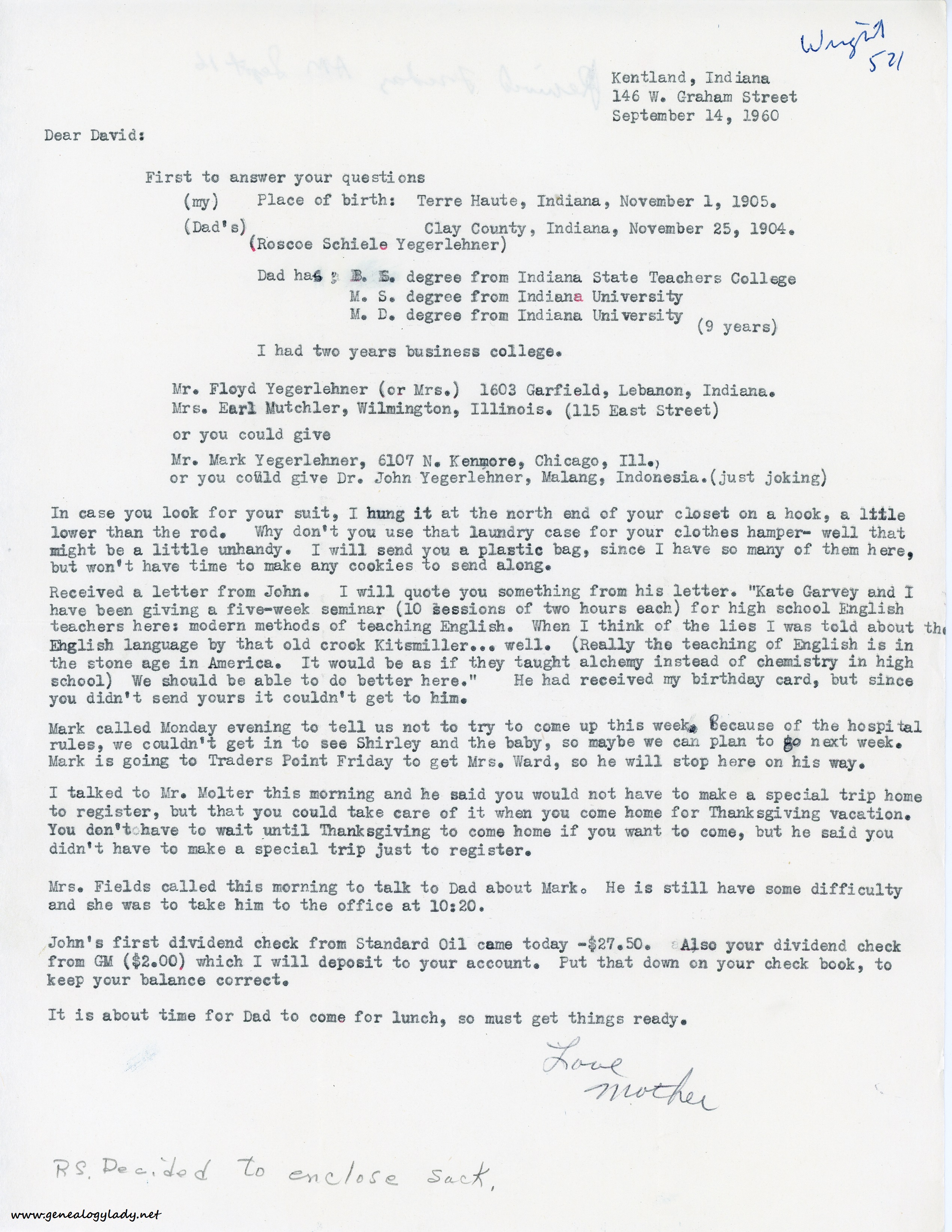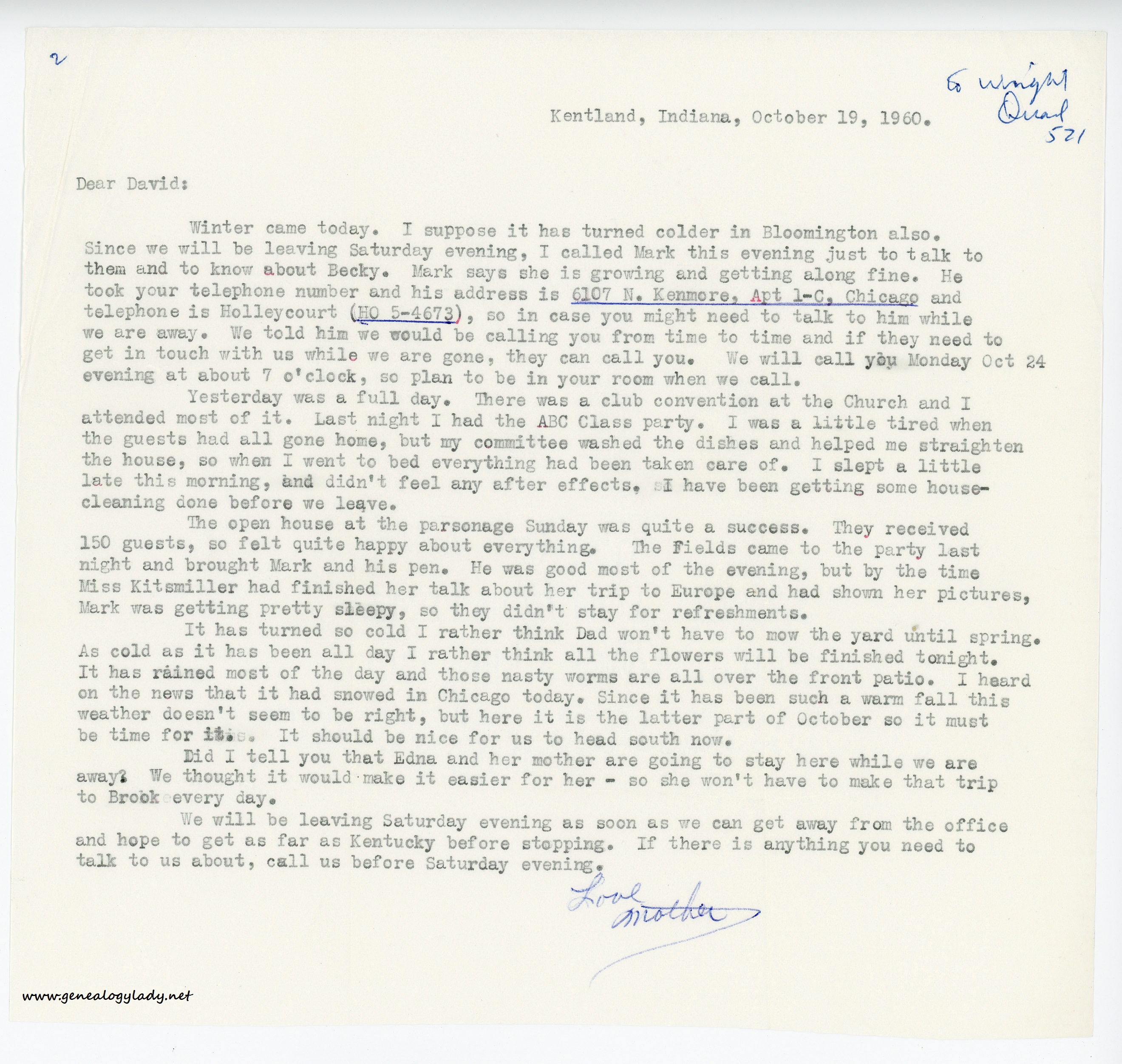 Winter came today. I suppose it has turned colder in Bloomington also. Since we will be leaving Saturday evening, I called Mark this evening just to talk to them and to know about Becky. Mark says she is growing and getting along fine. He took your telephone number and his address is 6107 N. Kenmore, Apt. 1-C, Chicago and telephone is Holleycourt (HO 5-4673), so in case you might need to talk to him while we are away. We told him we would be calling you from time to time and if they need to get in touch with us while we are gone, they can call you. We will call you Monday Oct. 24 evening at about 7 o’clock, so plan to be in your room when we call.