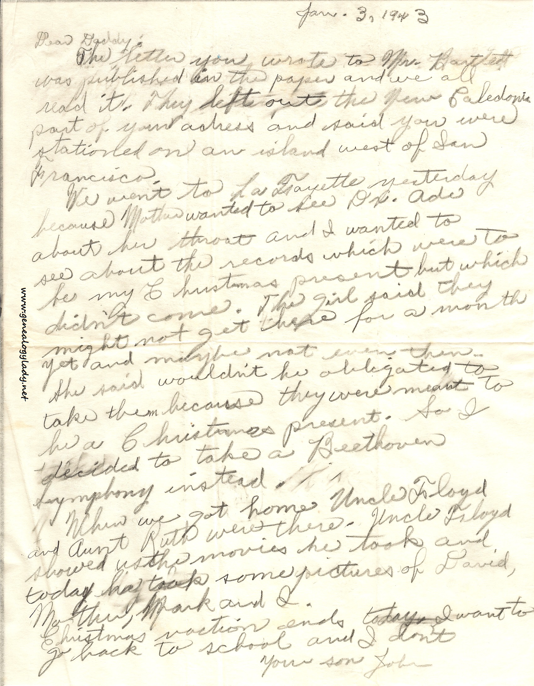 [page 4] I am planning to go to Laf. tomorrow to get Mother some medicine. It is the “Acidophilus Broth” & Dr. Cole said I could get it only at St. E. and it has to be kept on ice. Arlene wants to go along – she has an appointment with the dentist. Also Mary McGee – I think her last name is Arnold – is visiting Arlene now & she wants to go see Dr. Cole – She is going to have a baby before long.