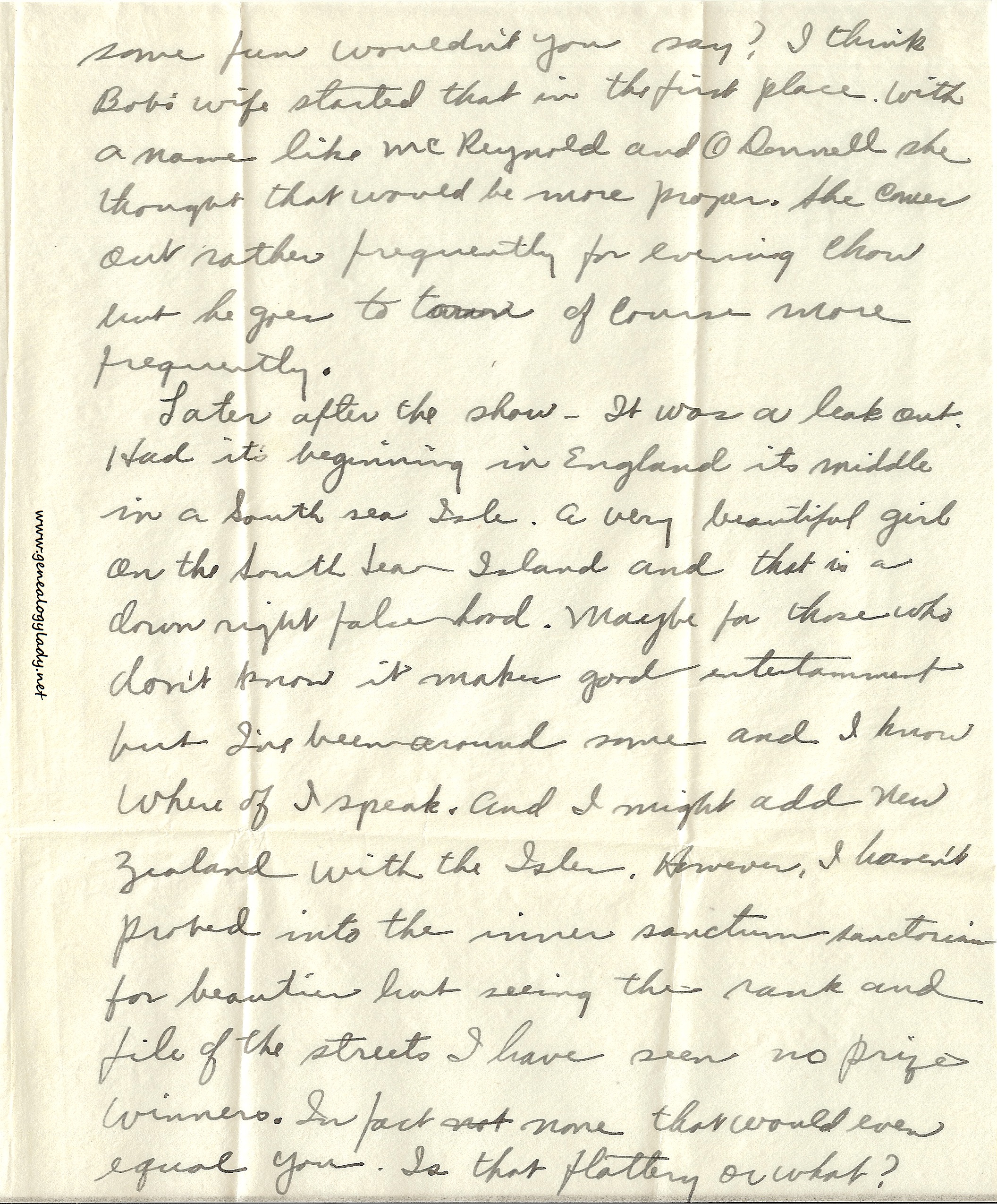 Later after the show – It was a leak out. Had its beginning in England, its middle in a South Sea Isle. A very beautiful girl on the South Sea Island and that is a downright falsehood. Maybe for those who don’t know it makes good entertainment but I’ve been around some and I know where of I speak, and I might add New Zealand with the Isles. However, I haven’t probed into the inner sanctum sanctorum for beauties but seeing the rank and file of the streets I have seen no prize winners. In fact not none that would even equal you. Is that flattery or what?