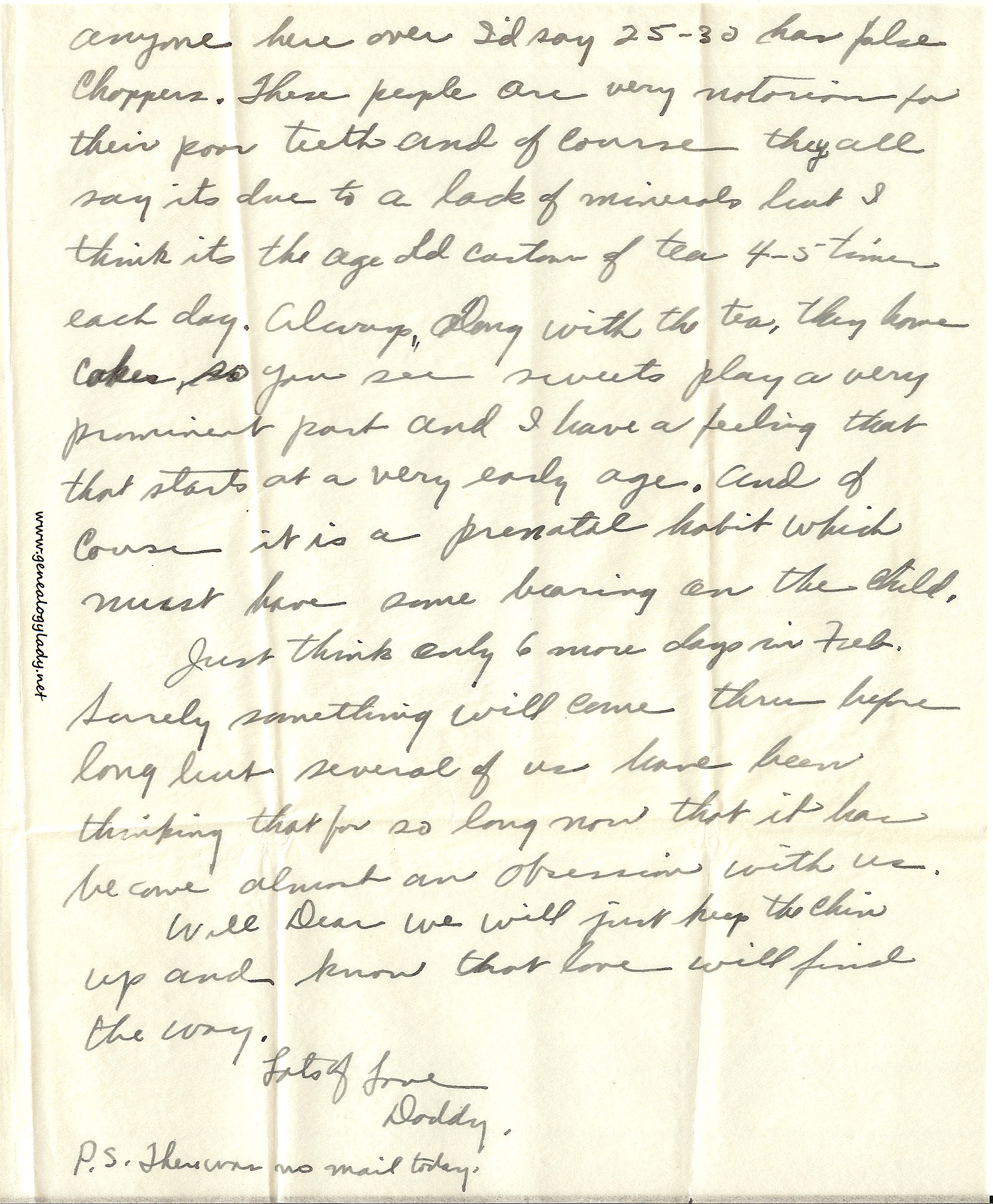 [page 4] Anyone here over I’d say 25-30 has false choppers. These people are very notorious for their poor teeth and of course they all say it’s due to a lack of minerals but I think it’s the age old custom of tea 4-5 times each day. Always, along with the tea, they have cakes, so you see sweets play a very prominent part and I have a feeling that that starts at a very early age. And of course it is a prenatal habit which must have some bearing on the child.