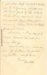 [page 3] I know she is glad to get away for a while. She has been taking liver shots and doesn’t seem to get much better but I think it’s the strain she is under. Irene is taking a 2 week vacation. They are going over to Monticello for a week and then stay home a week. This will be the first time Mrs. J. has been away from Jimmy for about 2 ½ years. I intended to give you a complete acc’t of our finances today but haven’t had time yet to figure things out – have been doing week-end work all morning. Will try to get it for next letter then if you get this one & not the next you will wish it had been in this one.