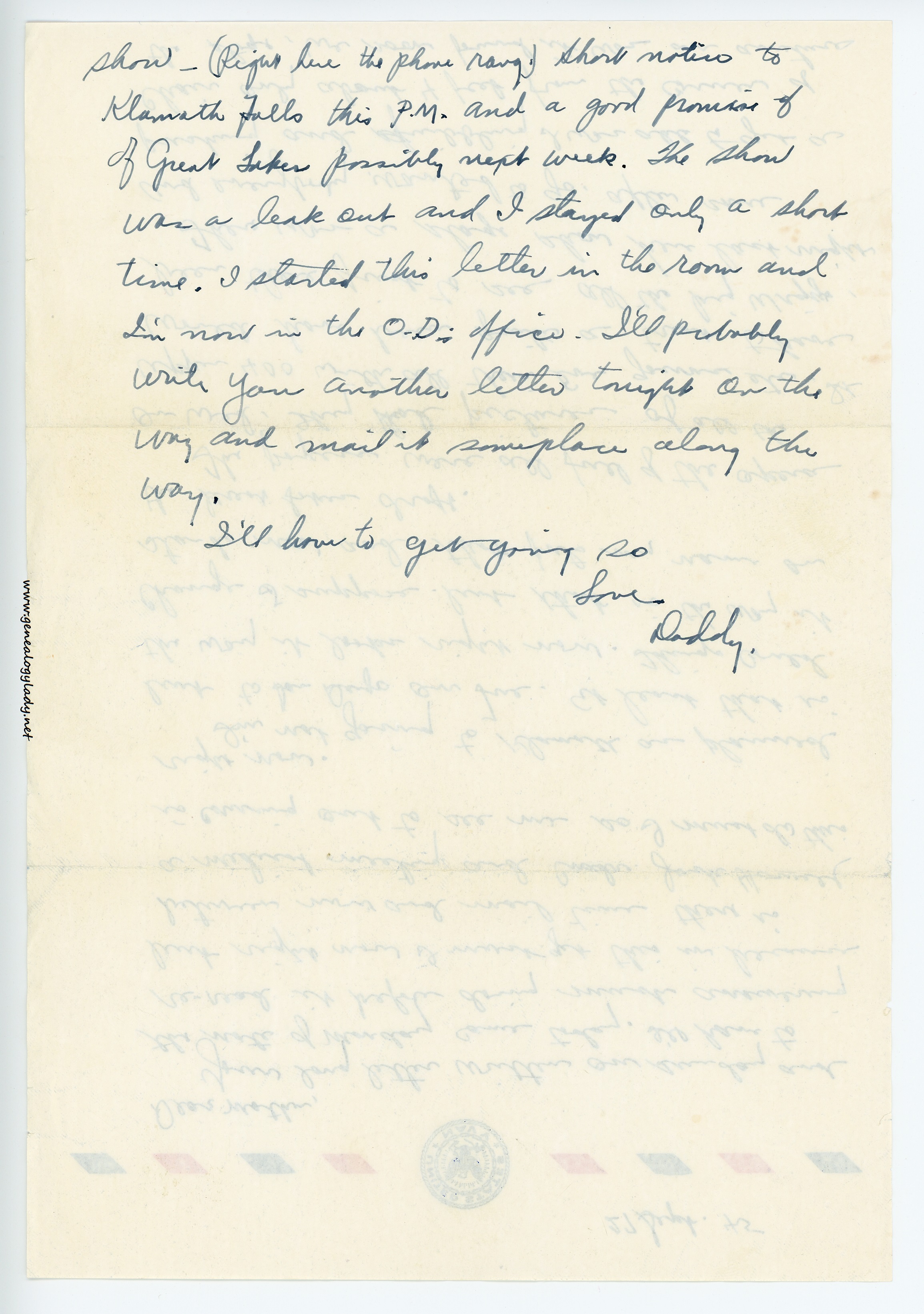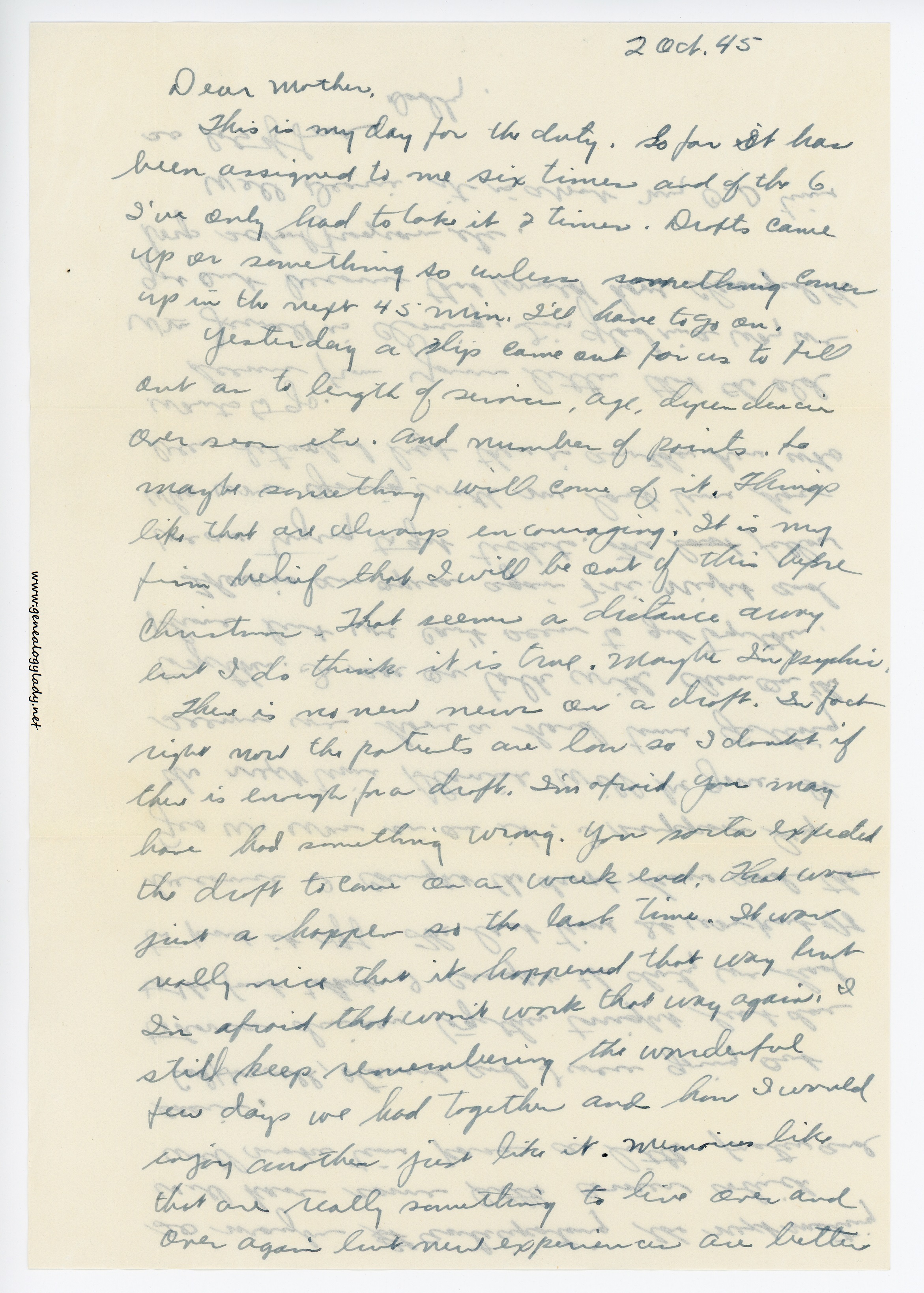 Yesterday a slip came out for us to fill out as to length of service, age, dependencies, overseas, etc., and number of points. So maybe something will come of it. Things like that are always encouraging. It is my firm belief that I will be out of this before Christmas. That seems a distance away but I do think it is true. Maybe I’m psychic.