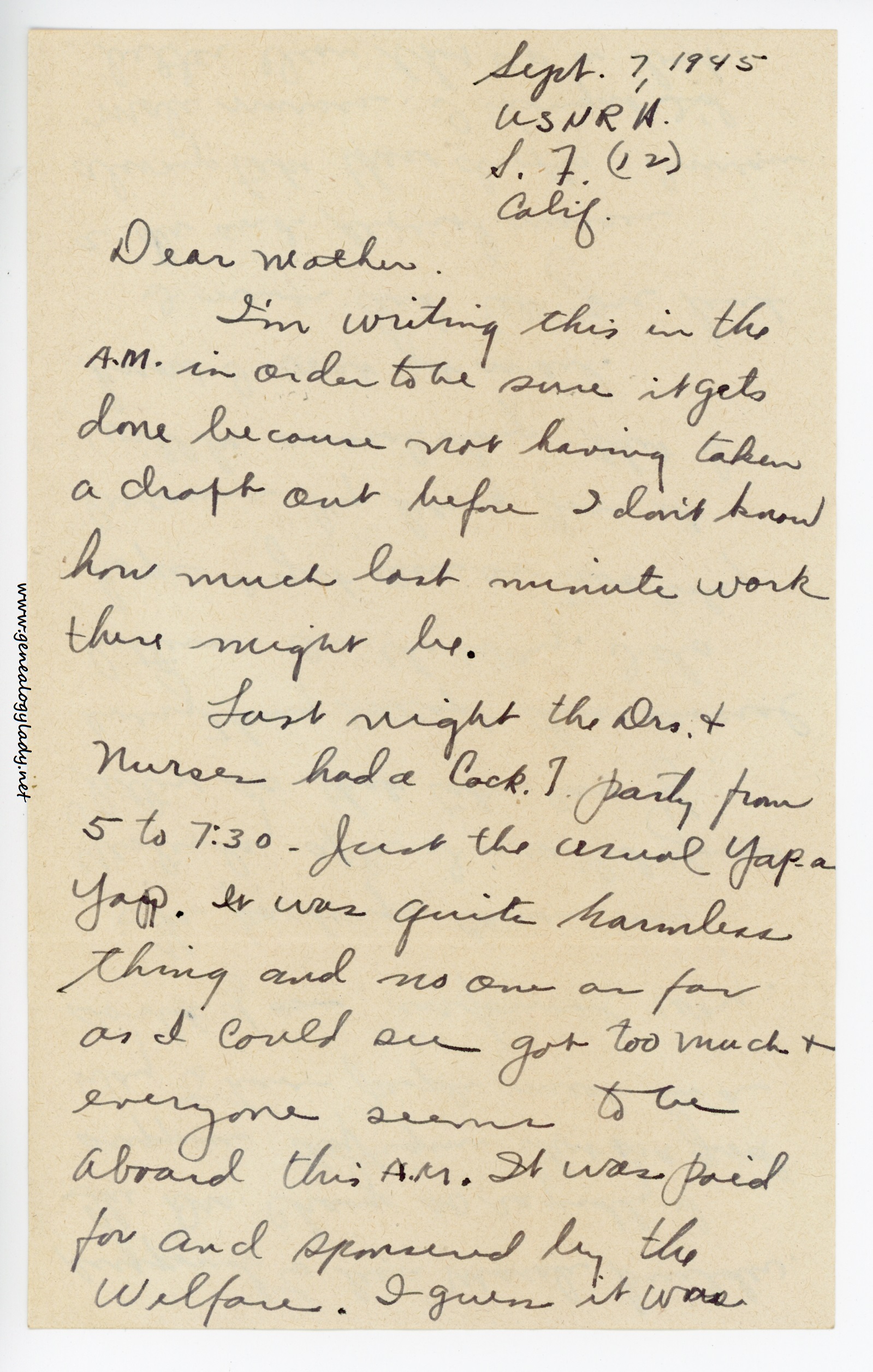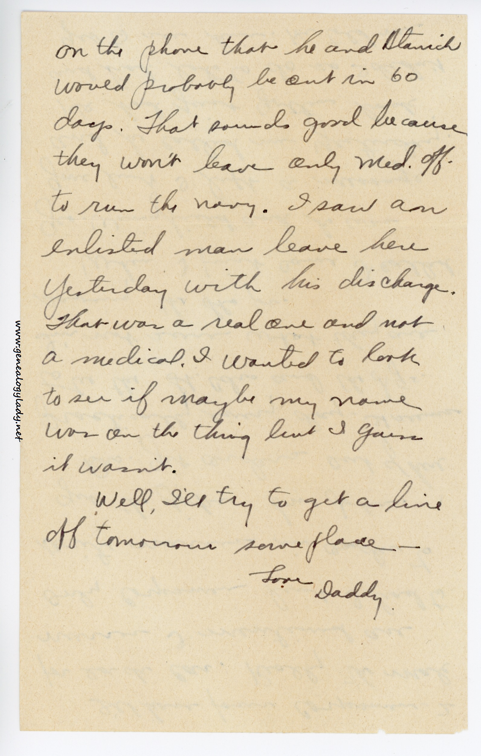 One of the Drs. here wondered if there was any athletic gear we might use. I looked at him with a very disgusted look and he said we don’t all creak like you do. Seems as if I’d heard things like that before but it makes no difference to me “I yam what I yam.” I suppose Mark is listening to Great Lakes or some of the local games. I just heard Ind. is ahead of Mich. This radio seems to be doing pretty good even though I haven’t gotten a longer areal.
