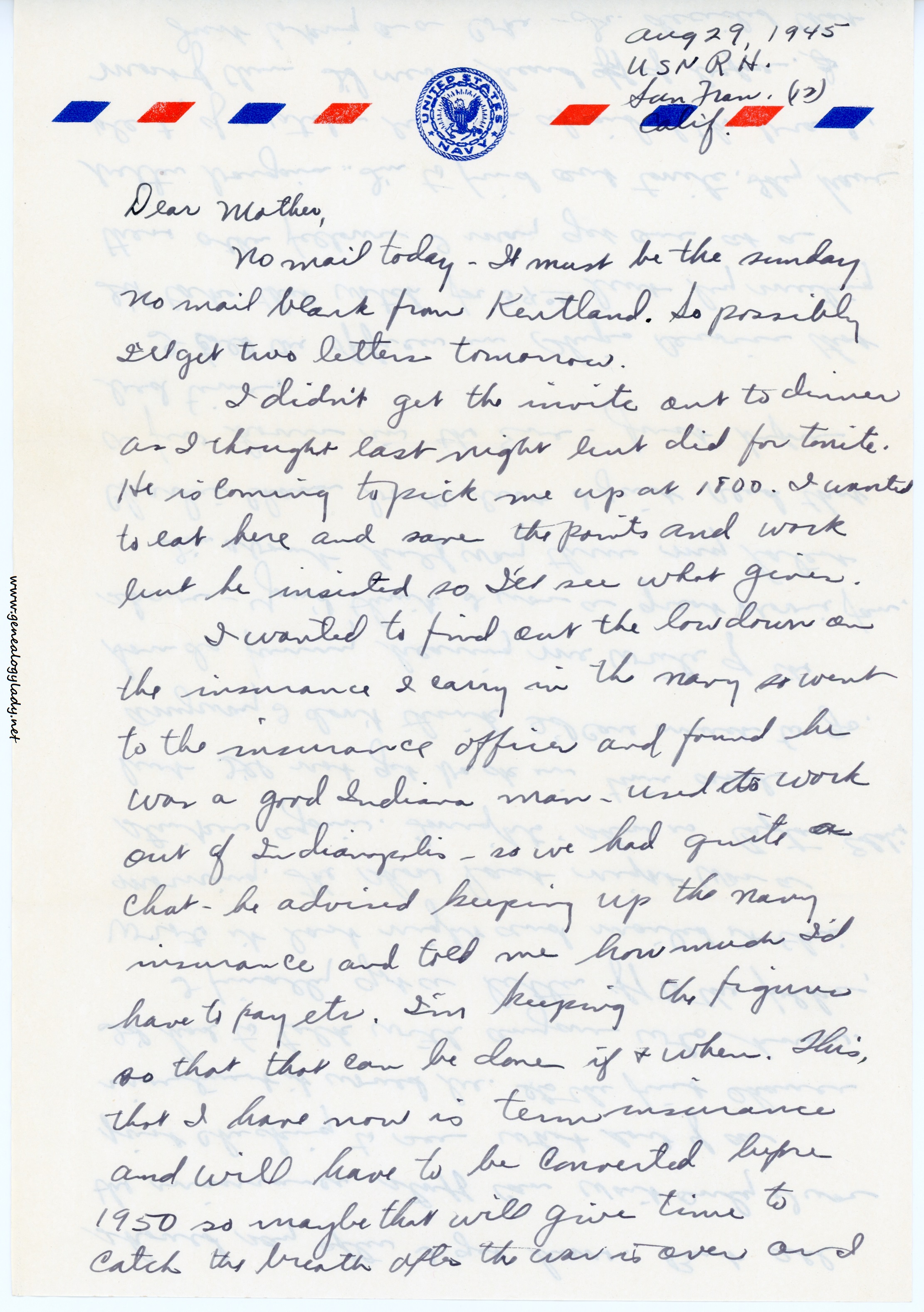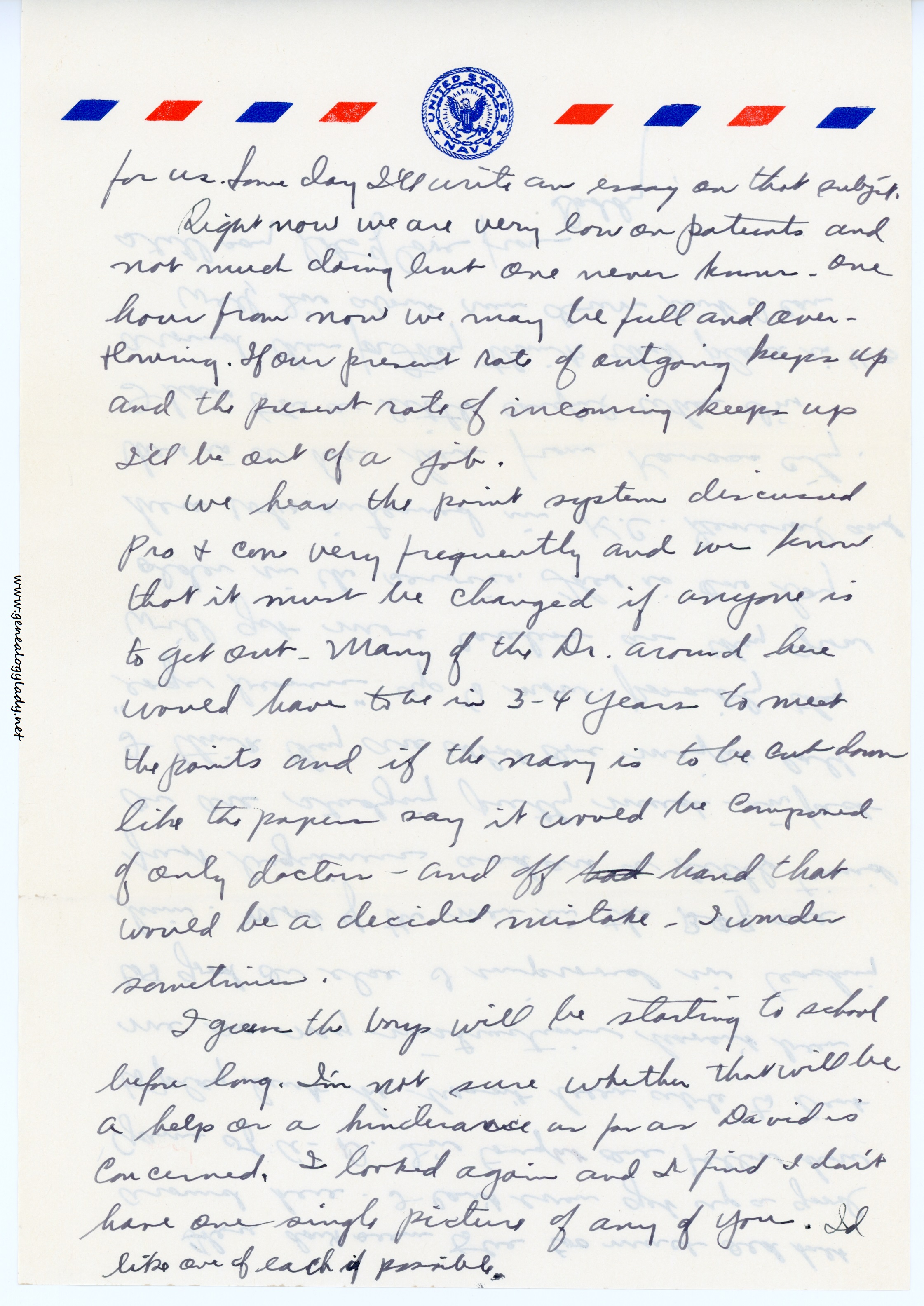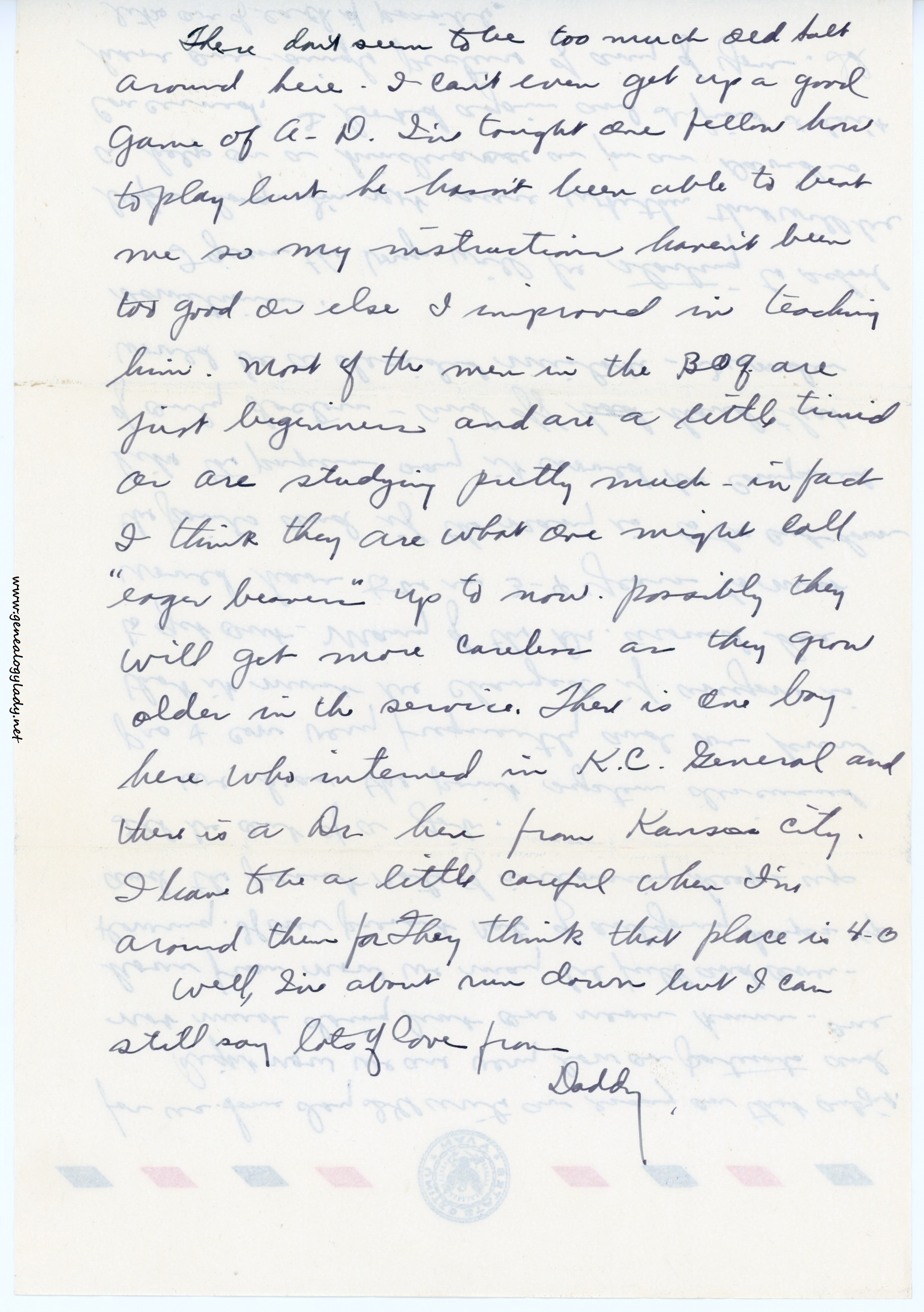 [page 3] very good and hard worker. He has now spent about 12 days in the navy and the fog around him is lifting in minute quantities. I have to help him dress and also give him the once over after he has finished. I think he has in a way adopted me as his God Father – anyway he is not the smart kind and will in time make a good officer. His dad and brother are Drs. in Northern New York. He went to Med. school in Canada and came directly to here from an internship there so he has a few of the “bloody” expressions of the British.
