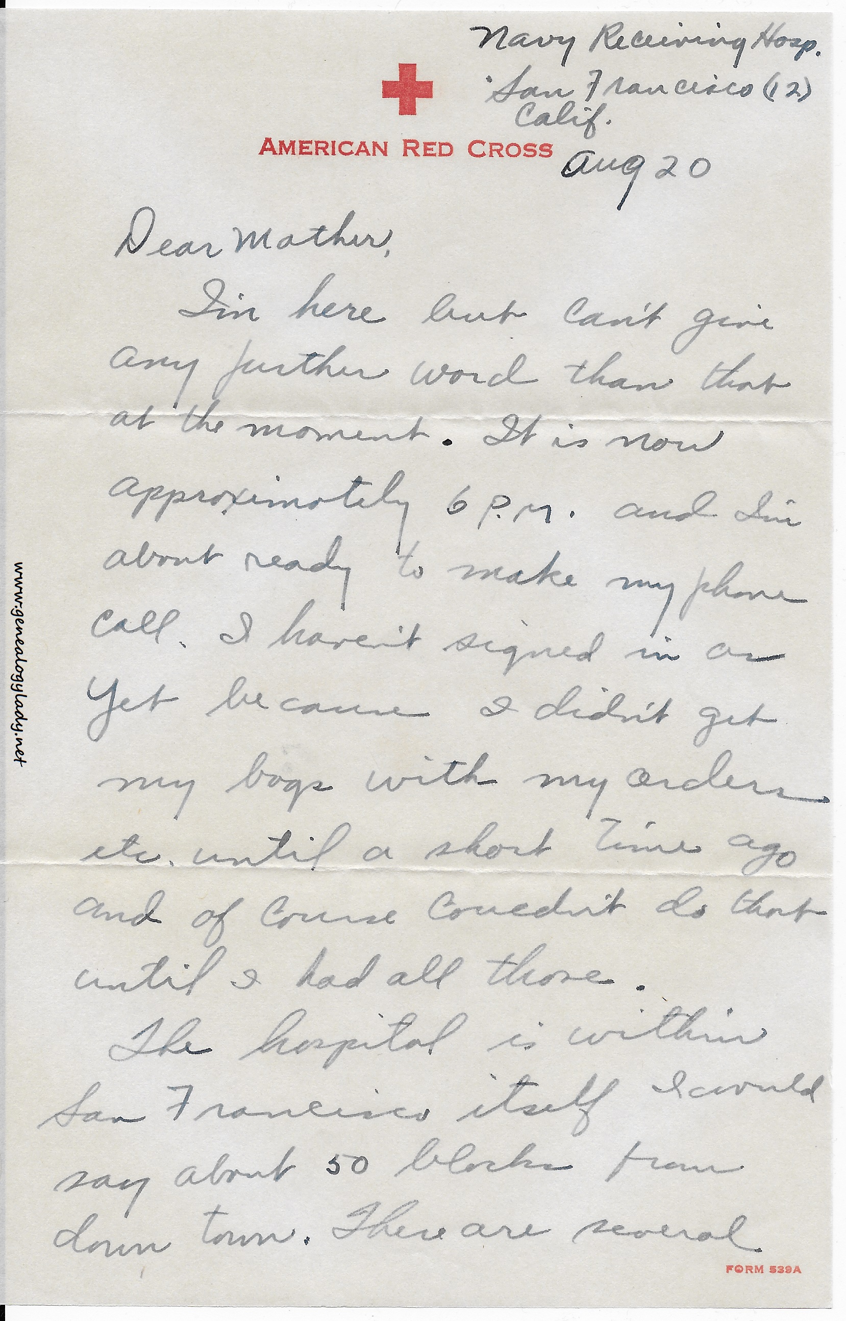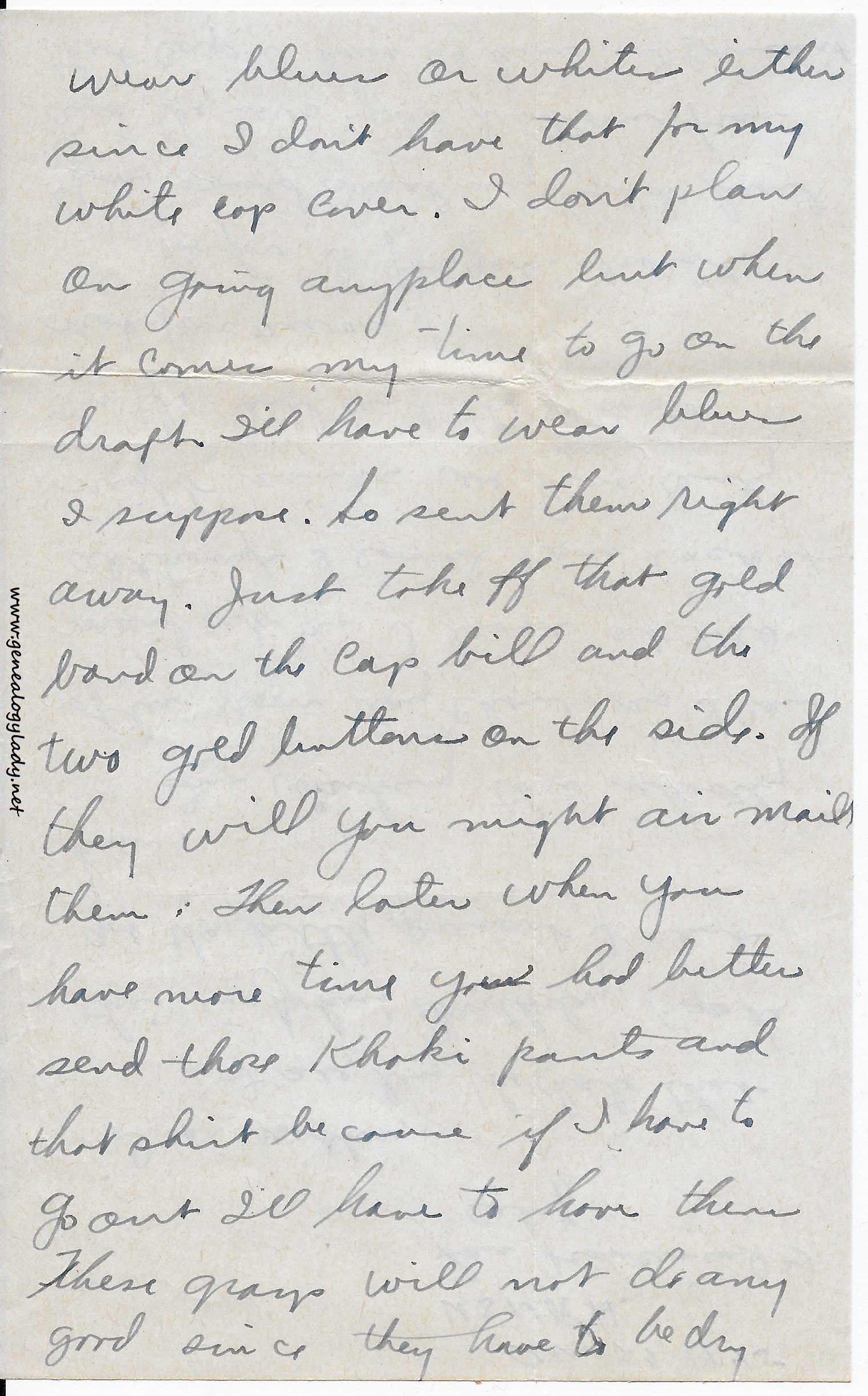 Monday just after noon day chow and the chin strap and buttons came but no letter. I’ve forgotten what day I wrote you for those things but they seemed to have made good time.