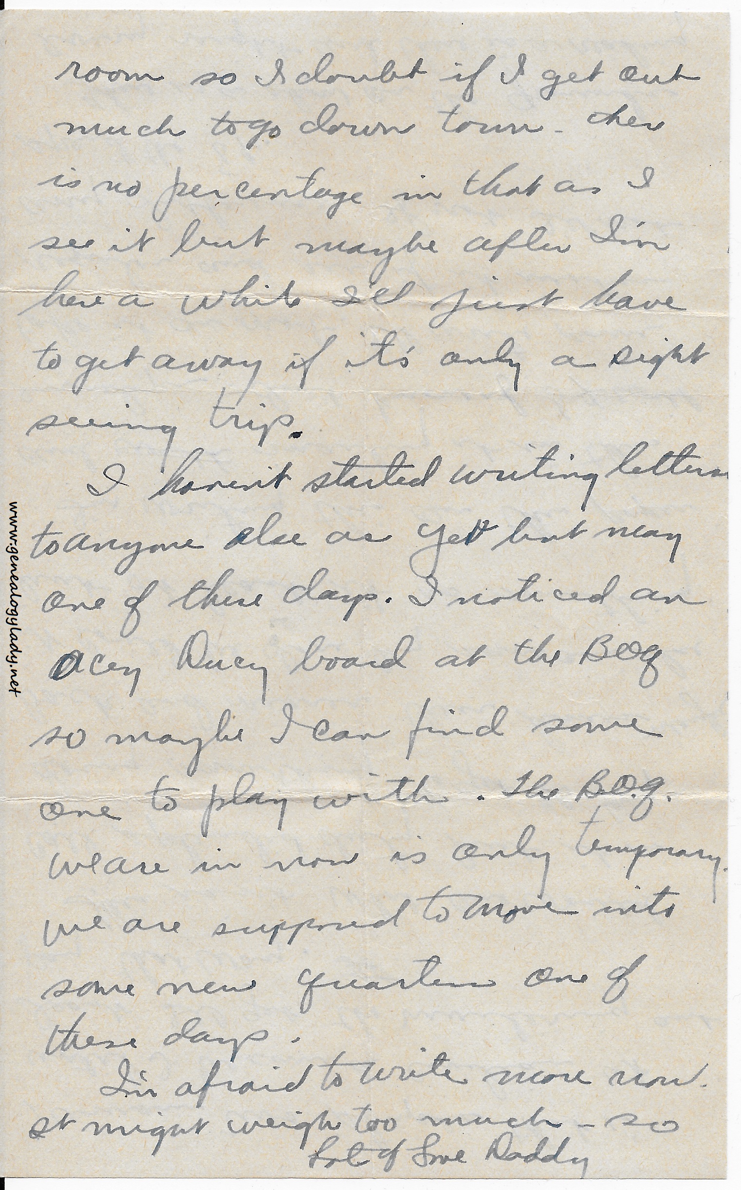[page 2] set about getting himself detached for oversea duty he thinks. Of course, he has been here for some time and was due for a little trip in that direction. He had an 18 hour lay over in Chicago and some of his brothers and his wife came up.